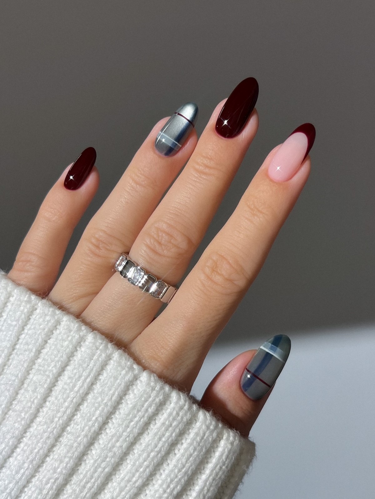 Концепция Mix&Match достигает пика популярности в декабре 2025, позволяя экспериментировать с разными дизайнами на каждом пальце. Главное правило – соблюдение единой цветовой гаммы или стилистики при разнообразии техник. Можно сочетать однотонное покрытие с френчем, «кошачьим глазом», стразами и минимализмом, создавая уникальную композицию из пяти разных дизайнов.