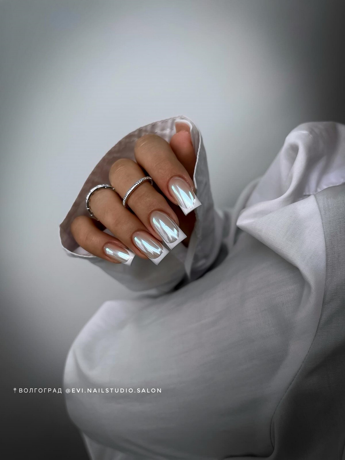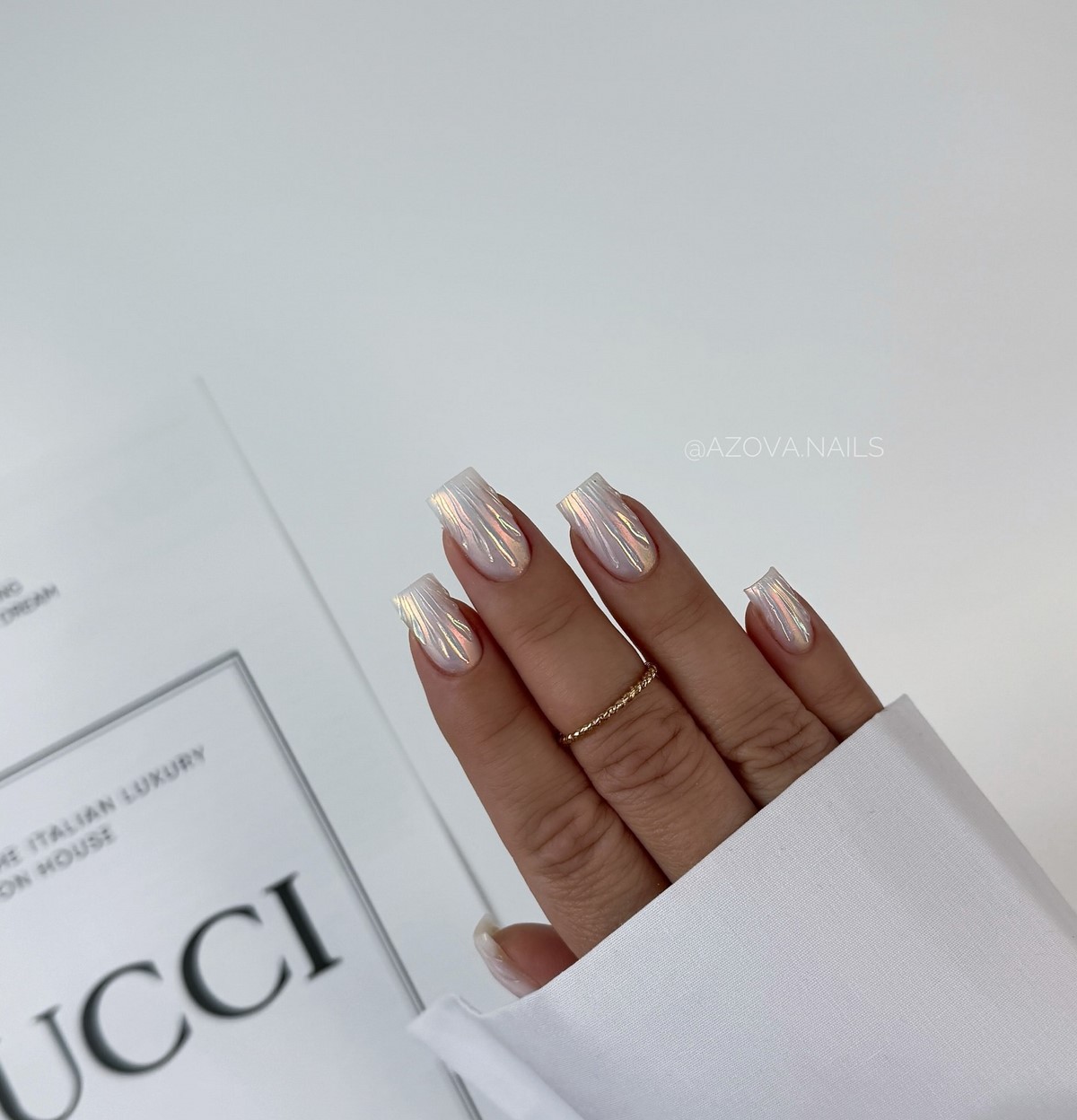 Перламутровое сияние жемчужной втирки превращает ногти в изысканное украшение с благородным блеском. Декабрь 2025 предлагает втирки с холодным подтоном – серебристо-голубые, розово-лиловые, светло-серые, создающие эффект морозного инея. Техника нанесения втирки на всю поверхность ногтя дает ровное перламутровое покрытие, а частичное применение позволяет создавать акценты и геометрические узоры.