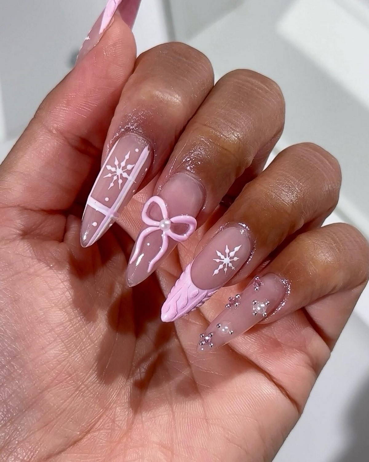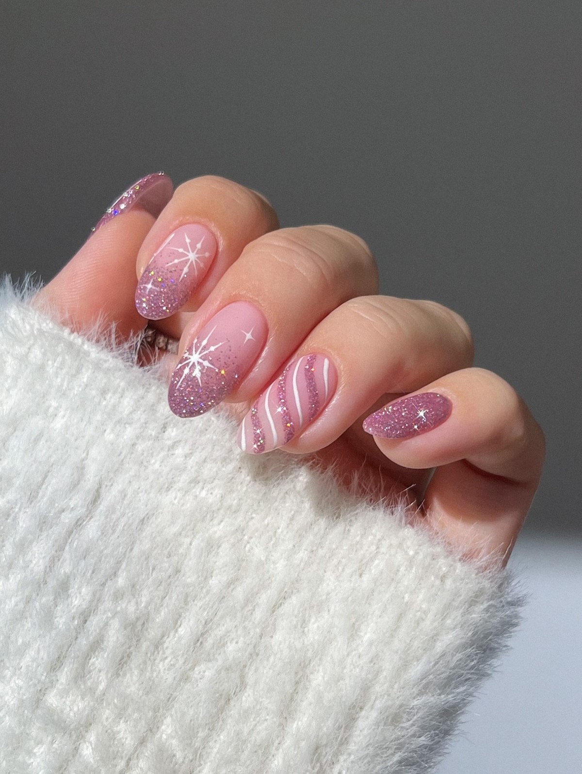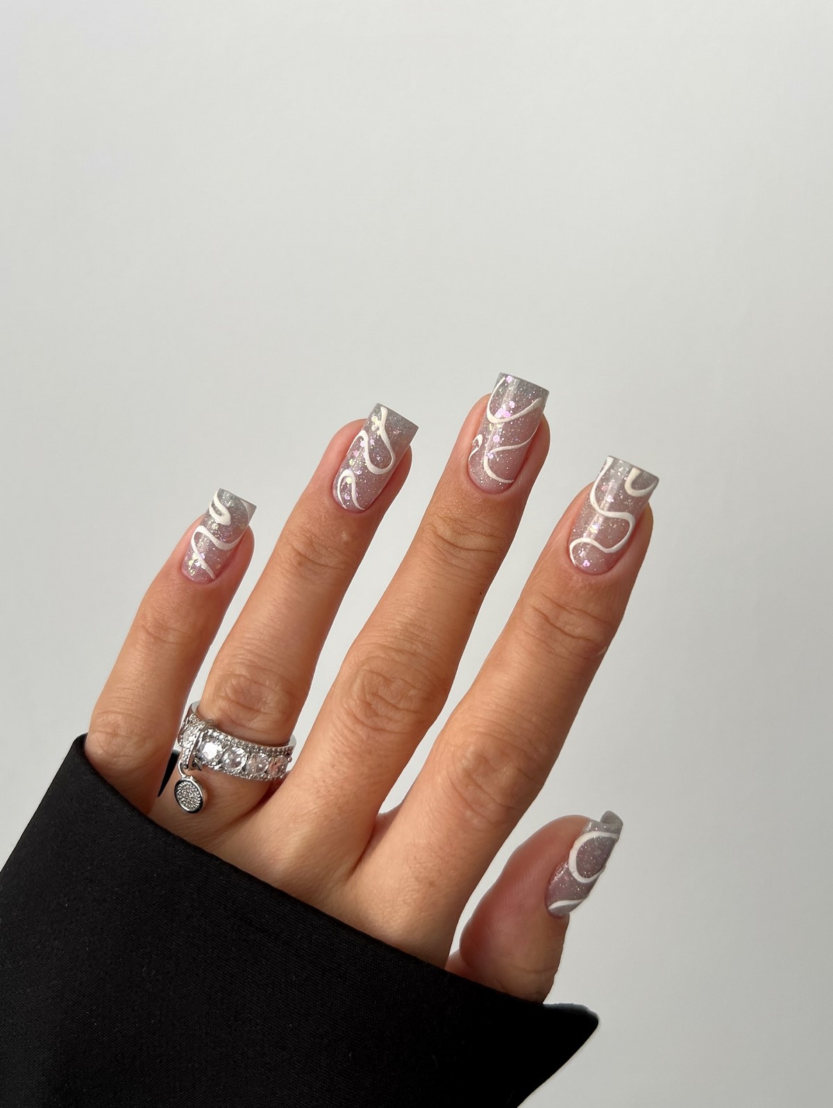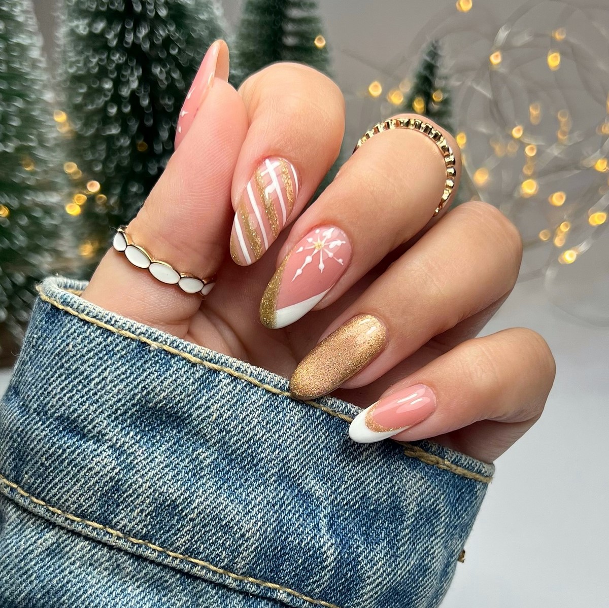 Завершает топ-12 самый праздничный вариант – маникюр с обилием блесток и изящными снежинками. Глиттер в декабре 2025 используется как полное покрытие ногтя для создания эффекта драгоценного металла, так и акцентно – на кончиках, в виде градиента или геометрических зон. Особенно актуальны голографические блестки, создающие радужные переливы, и крупные гексагональные блестки, напоминающие настоящие снежинки.