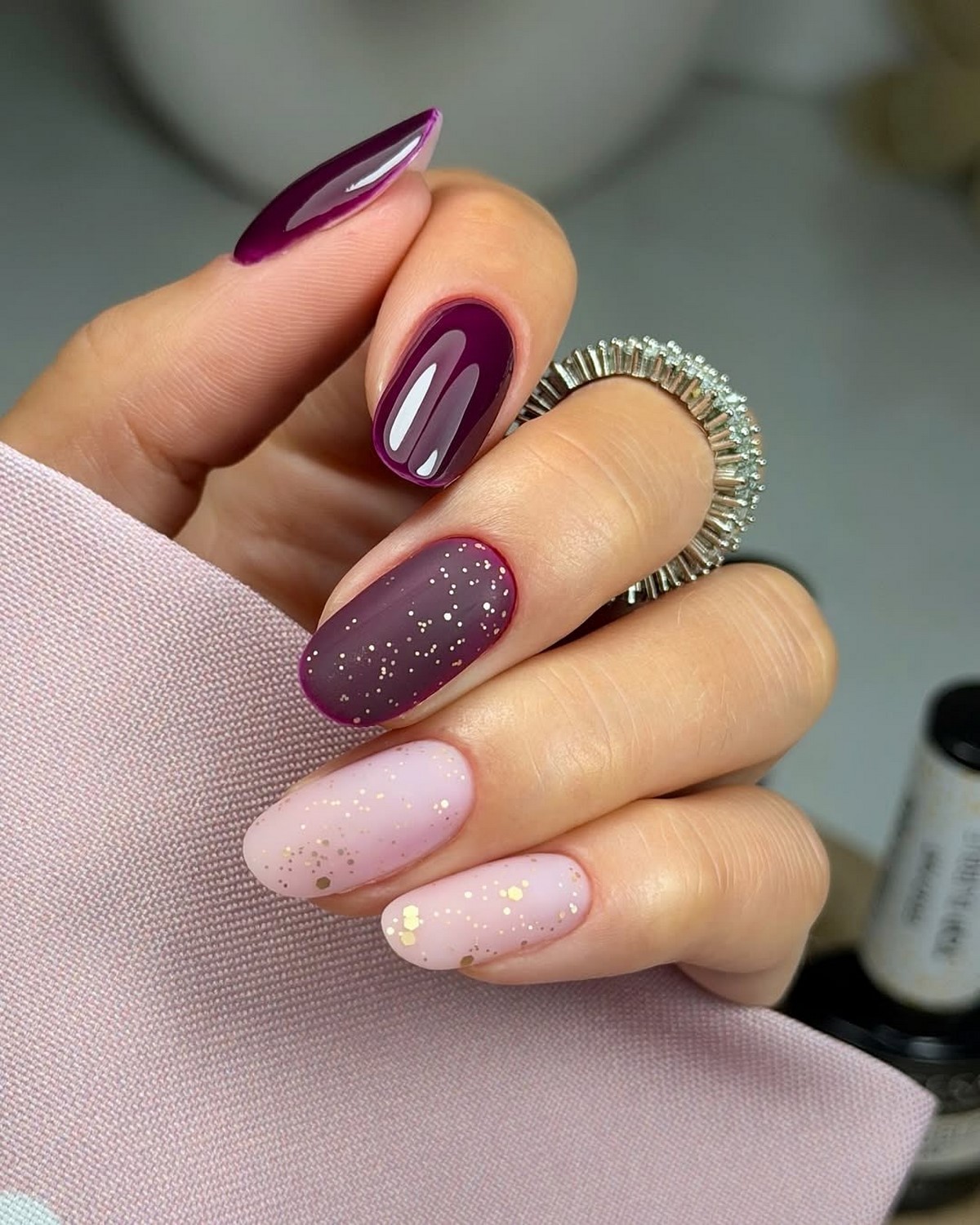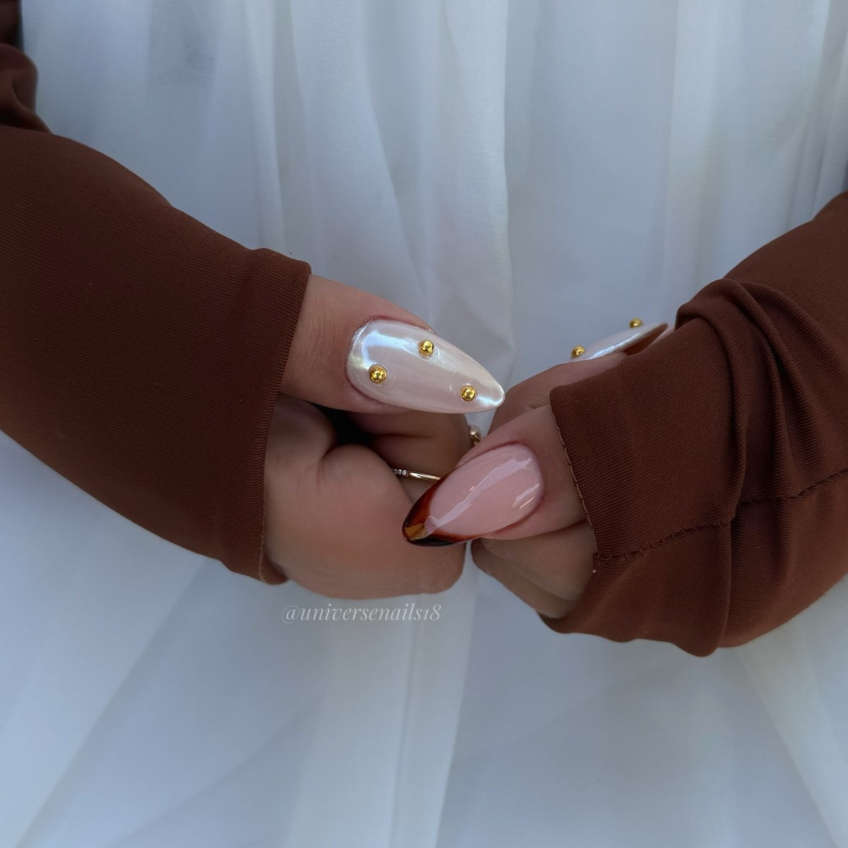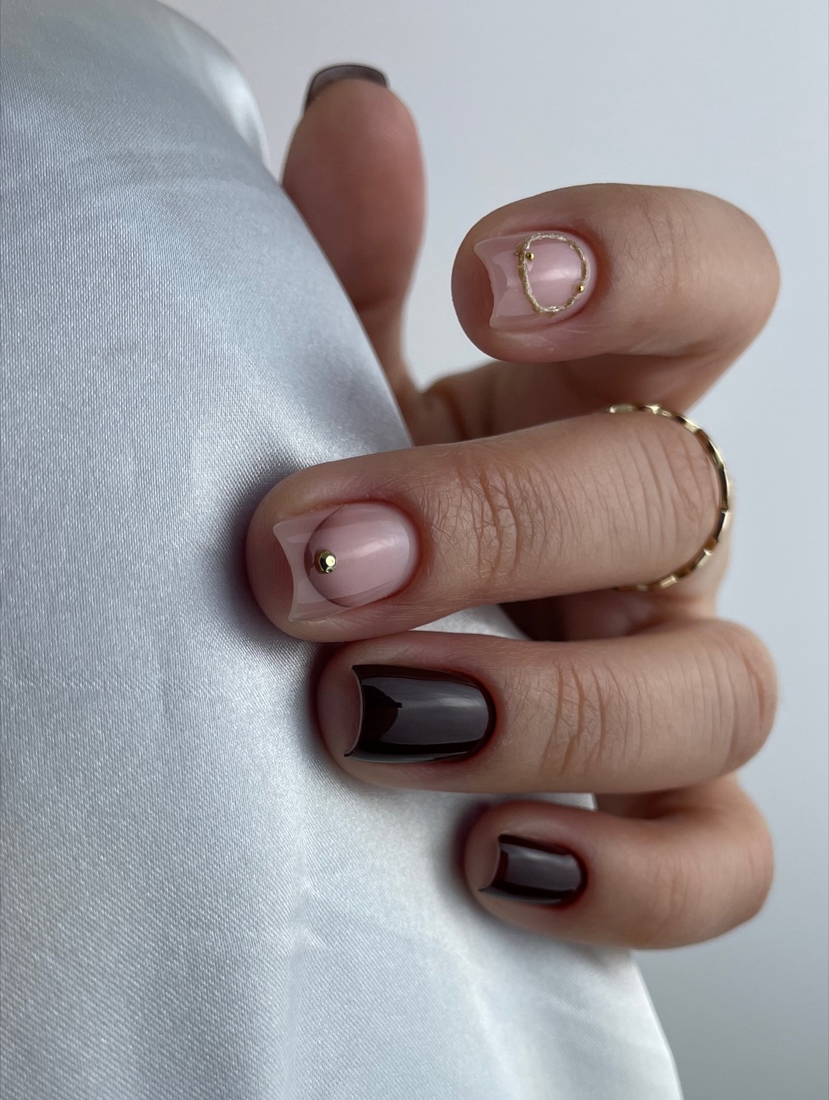 Асимметричный подход, когда дизайн на левой руке отличается от правой, но дополняет общую концепцию, становится трендом сезона. Популярно сочетание противоположностей: матовых и глянцевых текстур, темных и светлых оттенков, сложного и простого декора. Такой маникюр позволяет проявить креативность и создать действительно индивидуальный образ, отражающий многогранность личности.