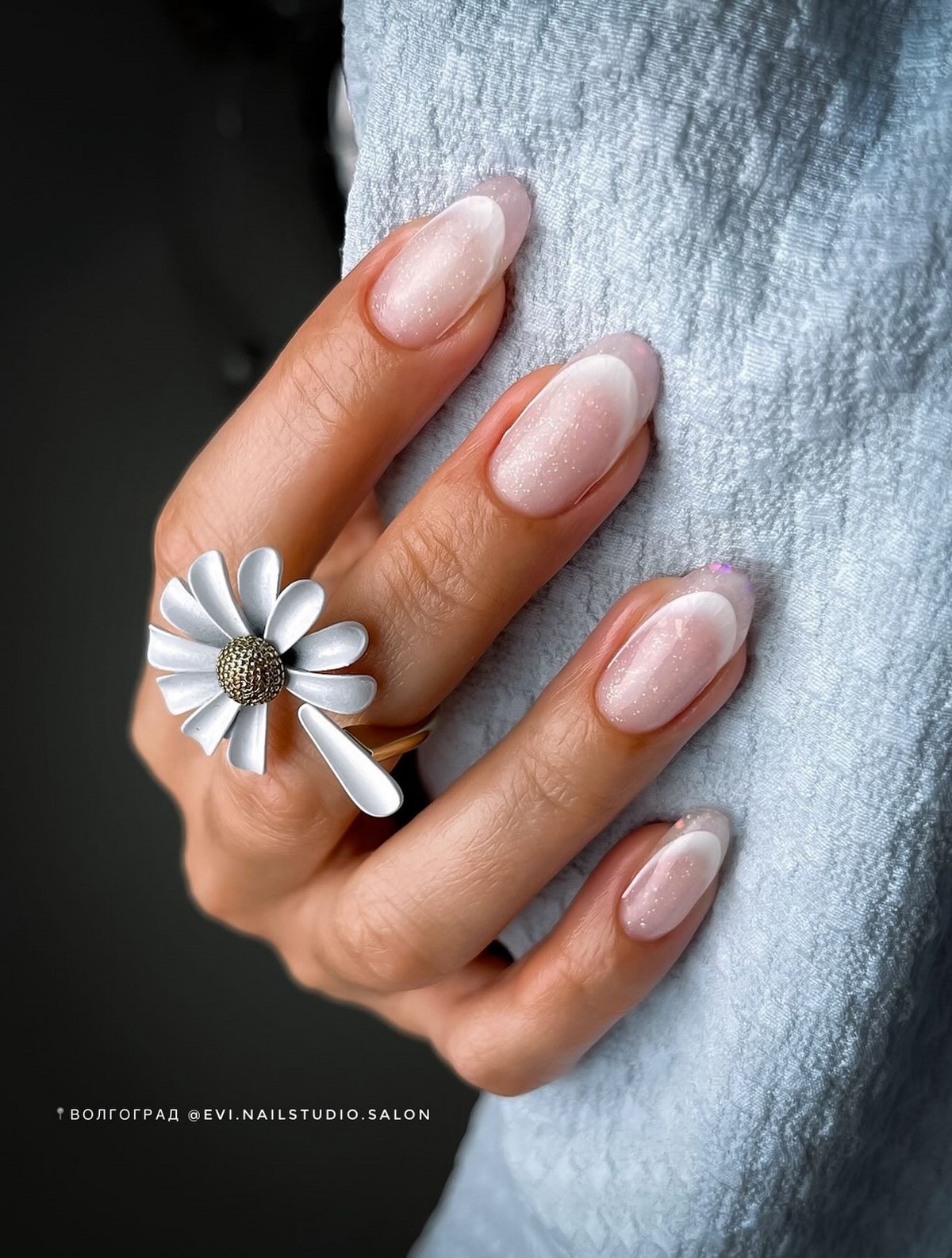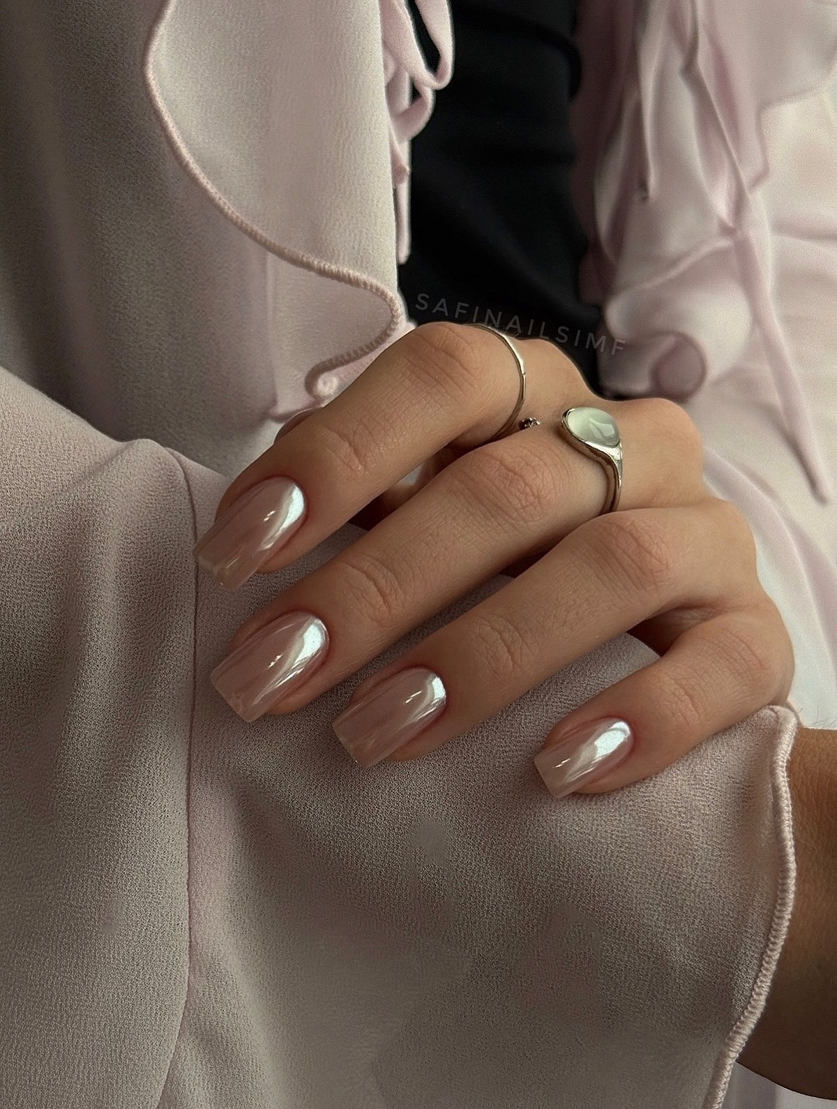 Комбинация жемчужной втирки с матовым топом на части ногтя создает интересную игру текстур. Особенно элегантно смотрится втирка на коротких ногтях квадратной или мягко-квадратной формы, где перламутр не перегружает образ. Многослойная техника, когда втирка наносится на разные оттенки базы, создает сложные переливы, меняющиеся в зависимости от освещения и угла зрения.