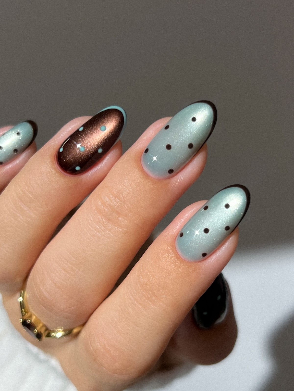 Вечный принт «горох» переосмыслен в декабрьских трендах 2025 через призму зимней эстетики и современных техник. Классическое сочетание черного и белого уступает место более сложным комбинациям: темно-синий с золотым горохом, бордовый с серебряным, изумрудный с белым. Размер точек варьируется от крупных акцентных на одном-двух ногтях до мелкого россыпью на всех пальцах.