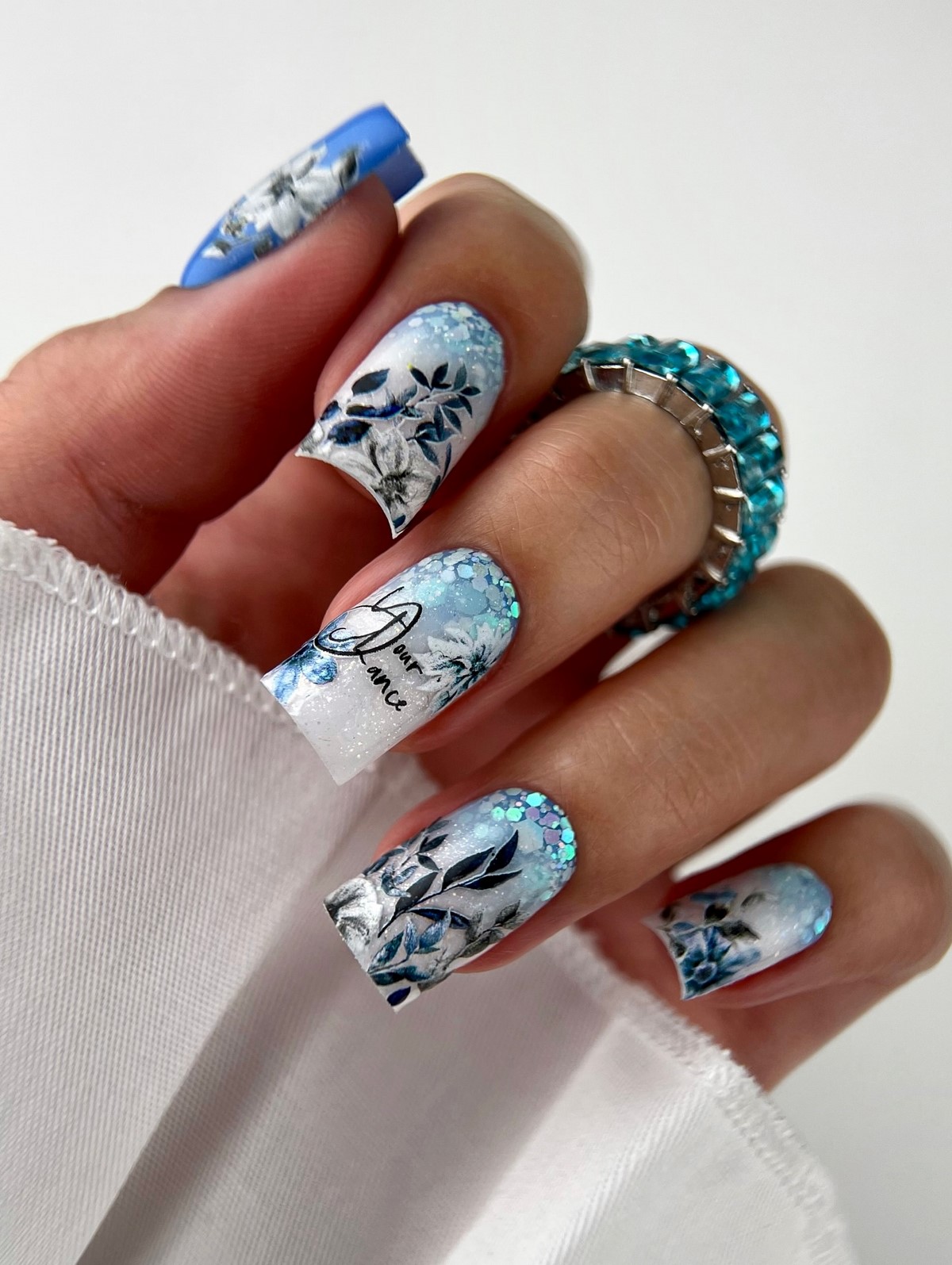 Абстрактная зимняя тематика использует характерные для сезона элементы без прямолинейных изображений: ледяные осколки из фольги, морозные разводы, эффект запотевшего стекла. Сине-белая гамма с добавлением серебра или голубого шиммера создает ощущение свежести и чистоты зимнего утра. Акцентные ногти с детальными рисунками сочетаются с однотонными, создавая сбалансированную композицию.