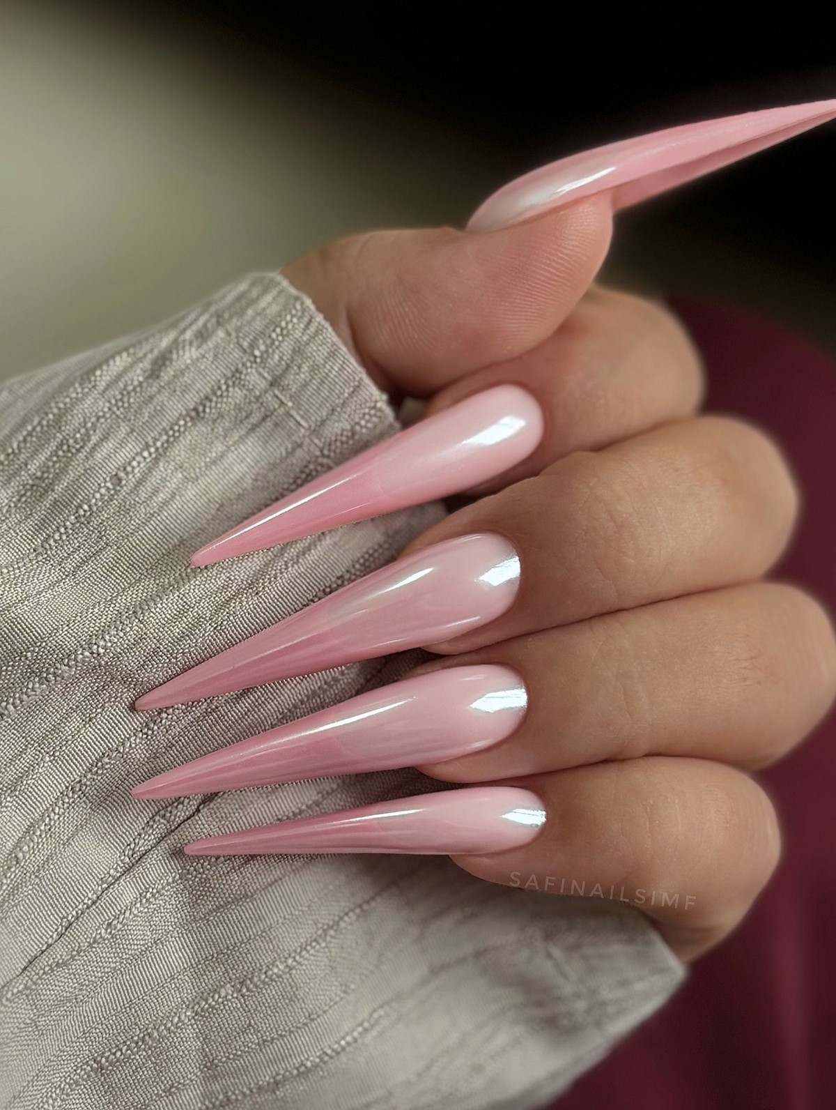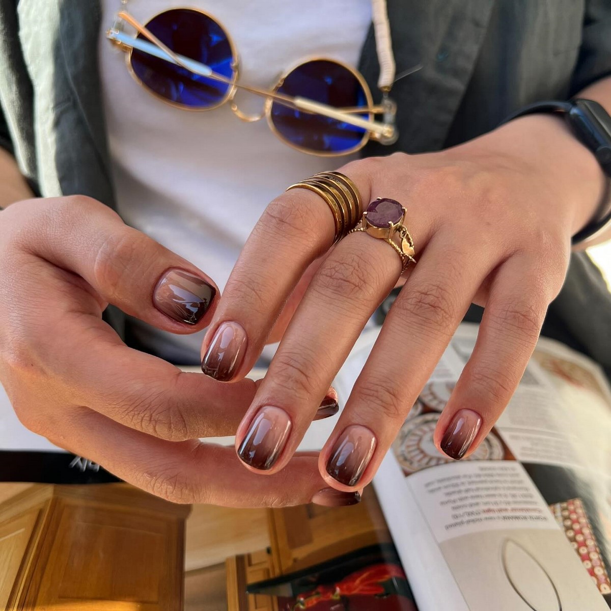 «Двойная аура» с несколькими центрами свечения на одном ногте добавляет динамики и современности дизайну. Популярно сочетание нюдовой базы с яркими акцентами ауры в фиолетовых, розовых или голубых тонах. Техника идеально подходит для тех, кто ищет баланс между яркостью и элегантностью, так как рассеянные границы делают даже насыщенные цвета деликатными и воздушными.