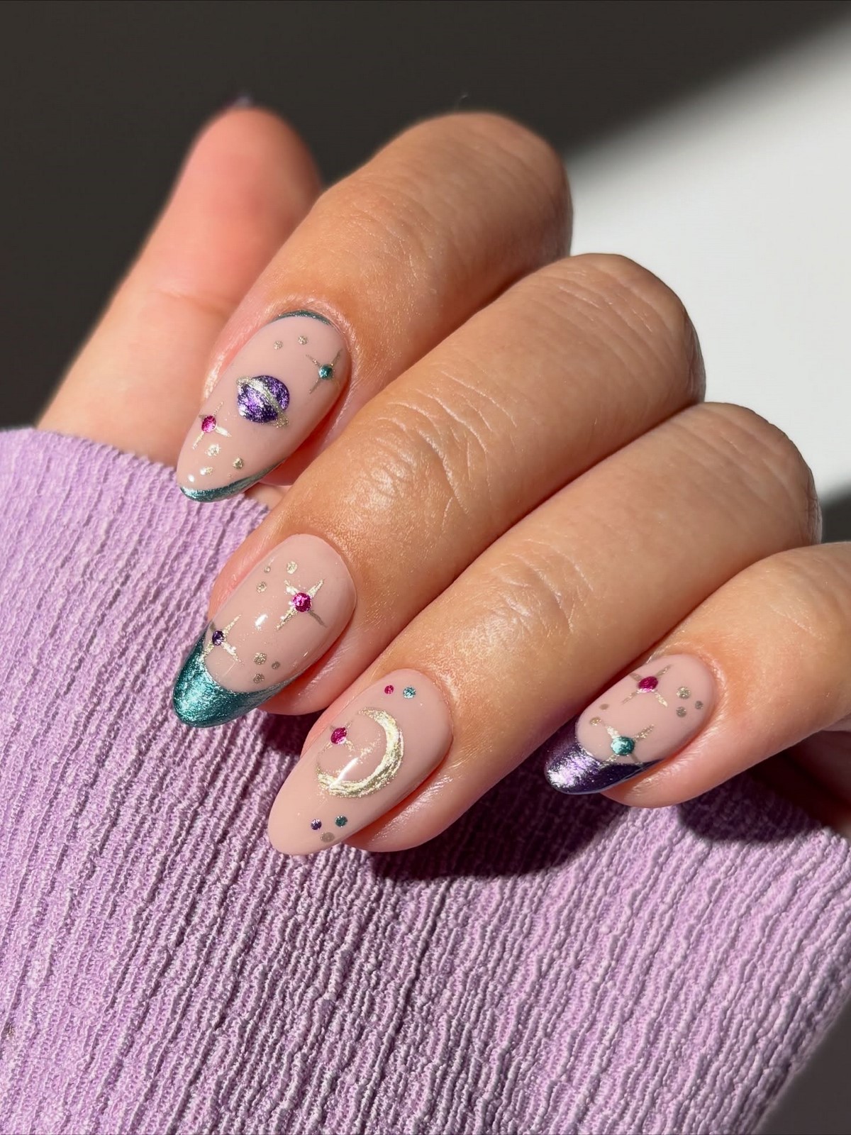 Вертикальный градиент, когда цвет меняется от одного края ногтя к другому, создает эффект северного сияния и выглядит особенно современно. Многоцветные переходы с использованием трех-четырех оттенков требуют мастерства, но результат поражает глубиной и объемом. Добавление мелких блесток в зону перехода цветов усиливает эффект сияния и делает маникюр еще более праздничным.