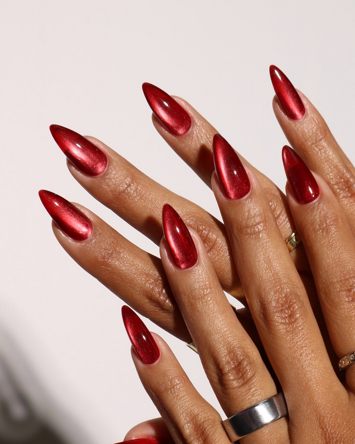 Комбинированный дизайн с «кошачьим глазом» на акцентных пальцах и однотонным покрытием на остальных создает сбалансированный образ. Техника позволяет добиться эффекта объемных волн, звездного свечения или мягких переходов цвета. Особенно эффектно «кошачий глаз» смотрится на длинных ногтях миндалевидной формы, где раскрывается вся красота магнитного рисунка и его динамика при движении рук.