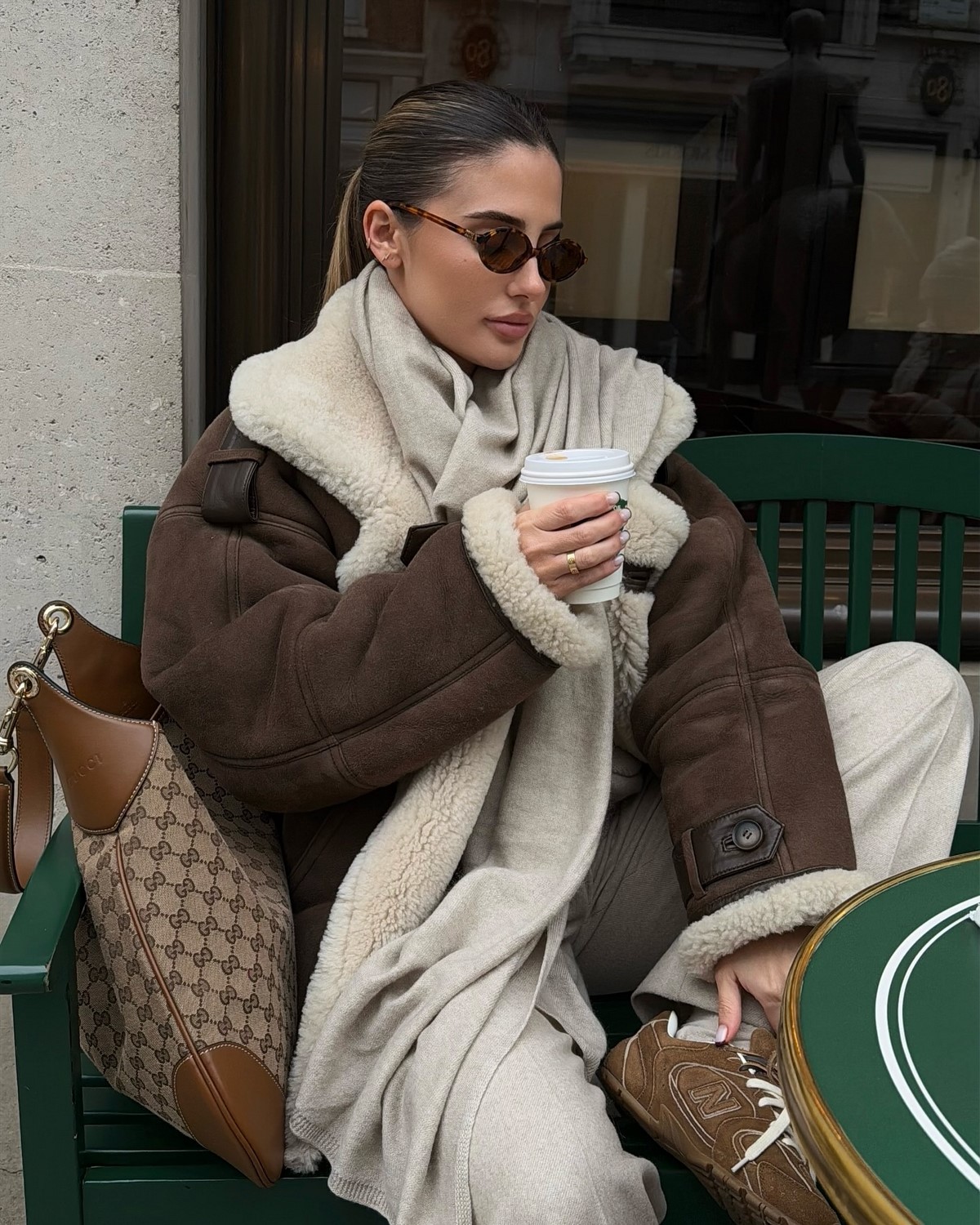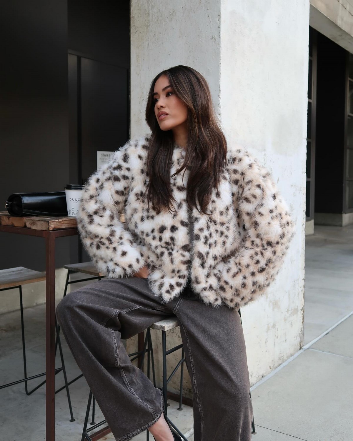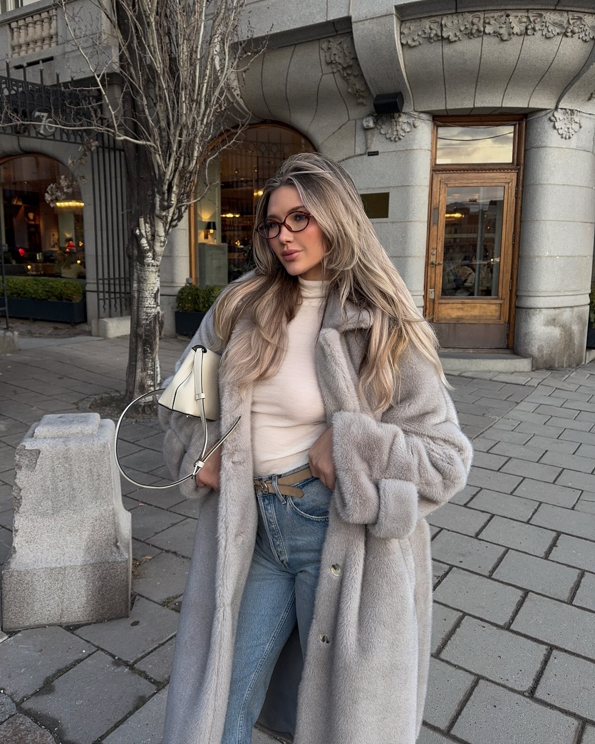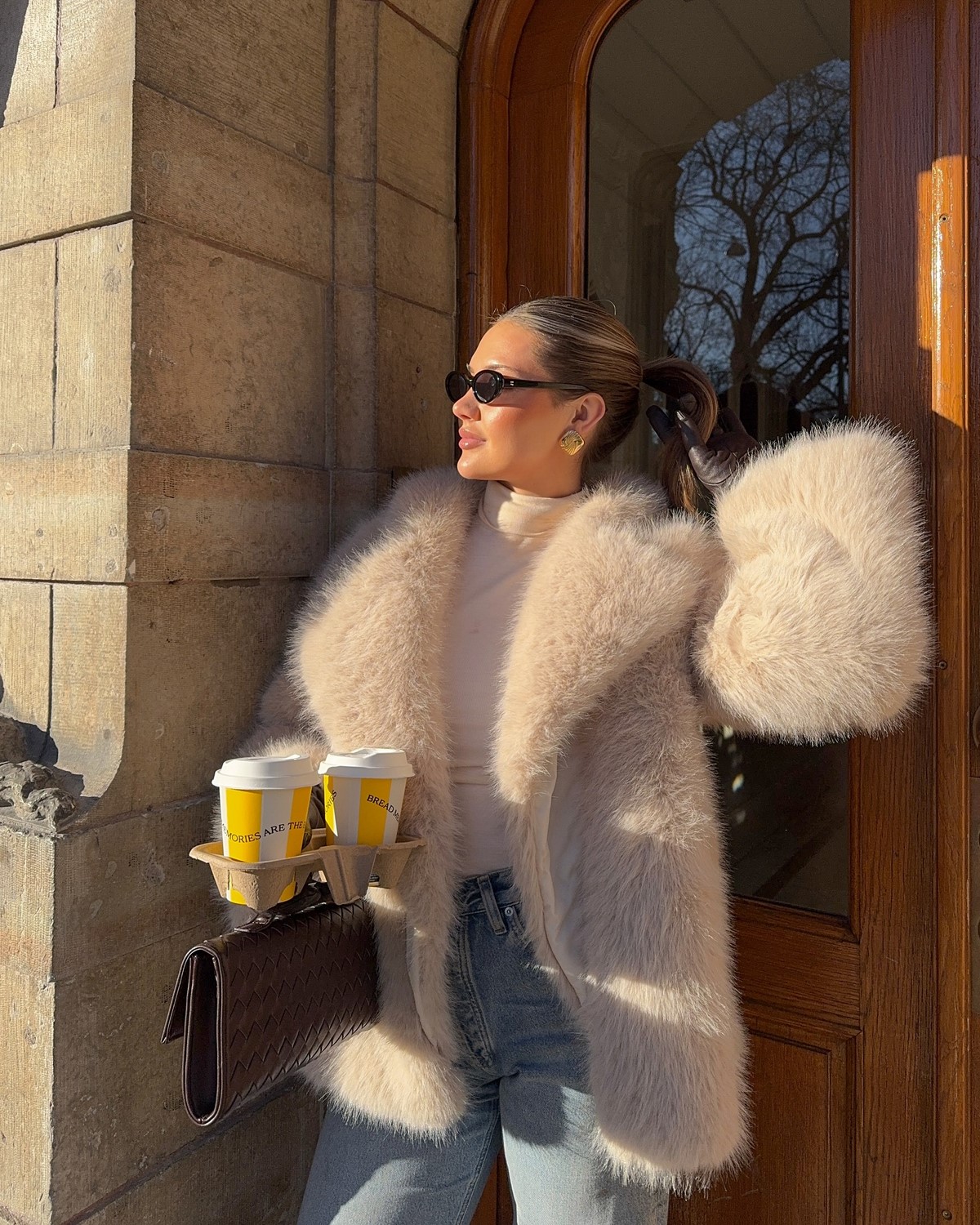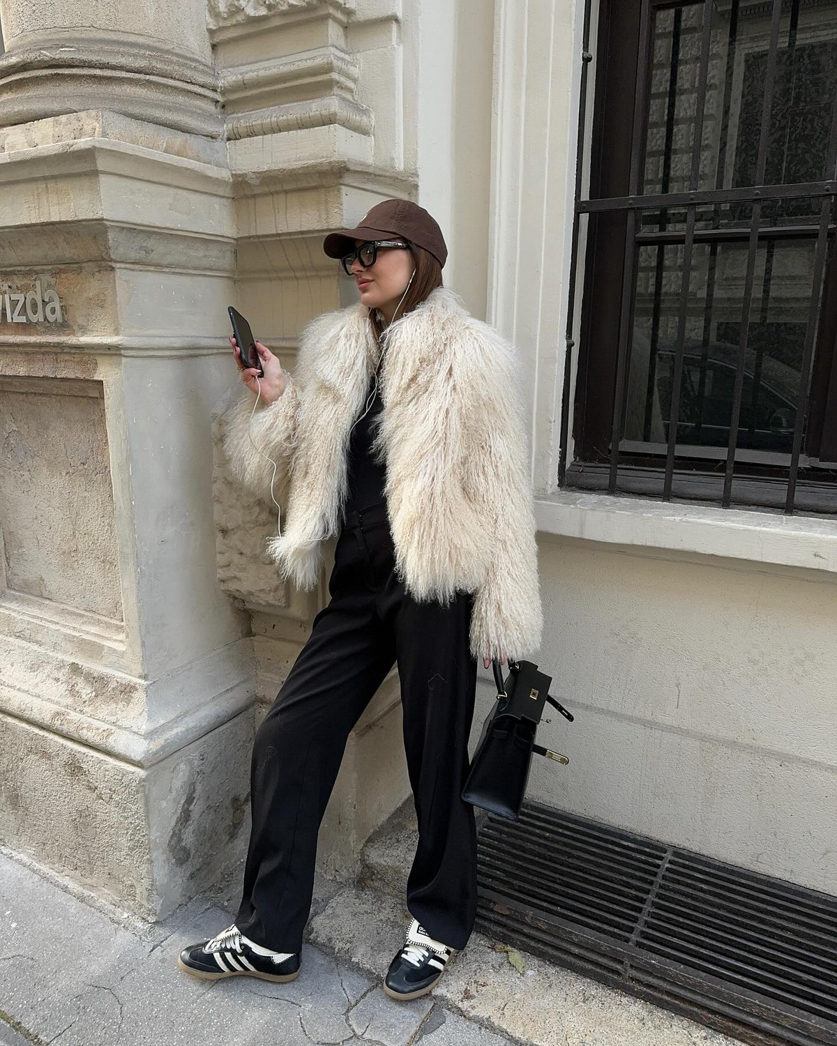 - Фактуры: кожа, замша, деним с эффектом потертости, мех — как натуральный, так и искусственный. Популярна многослойность с разными текстурами.