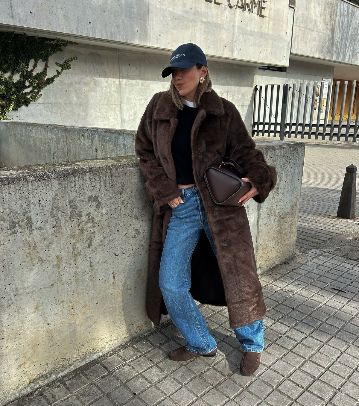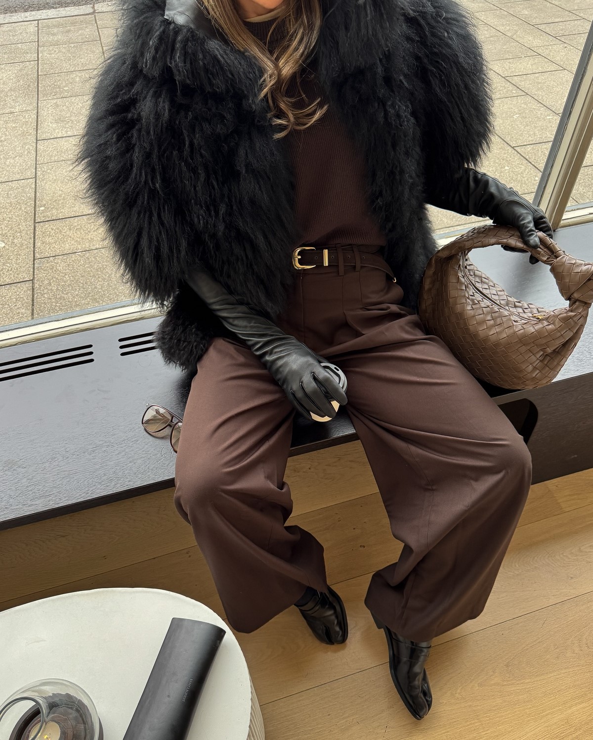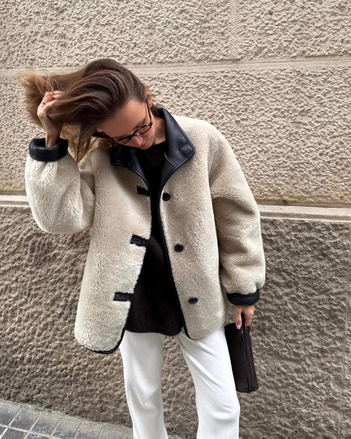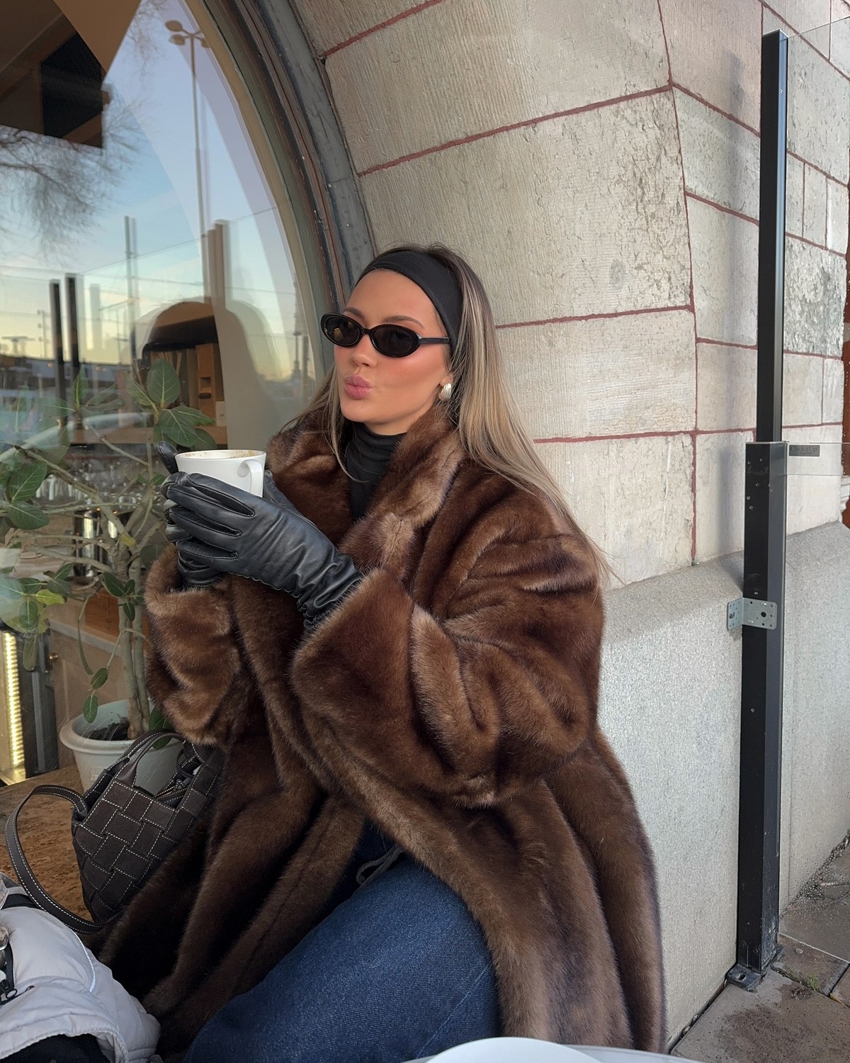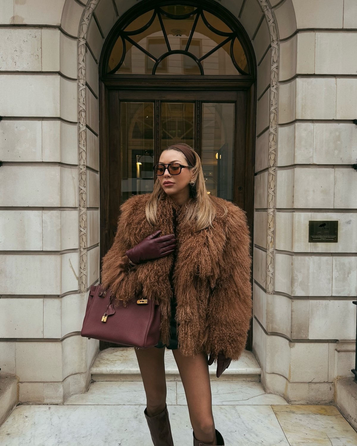- Фактуры: кожа, замша, деним с эффектом потертости, мех — как натуральный, так и искусственный. Популярна многослойность с разными текстурами.