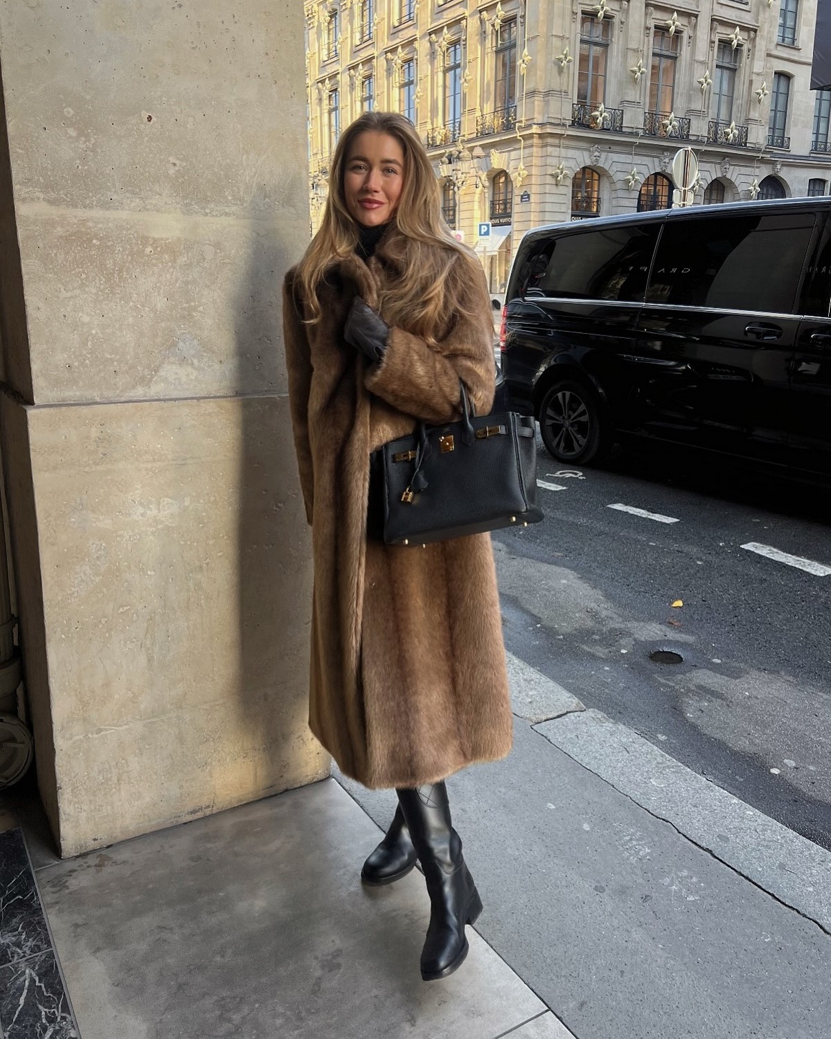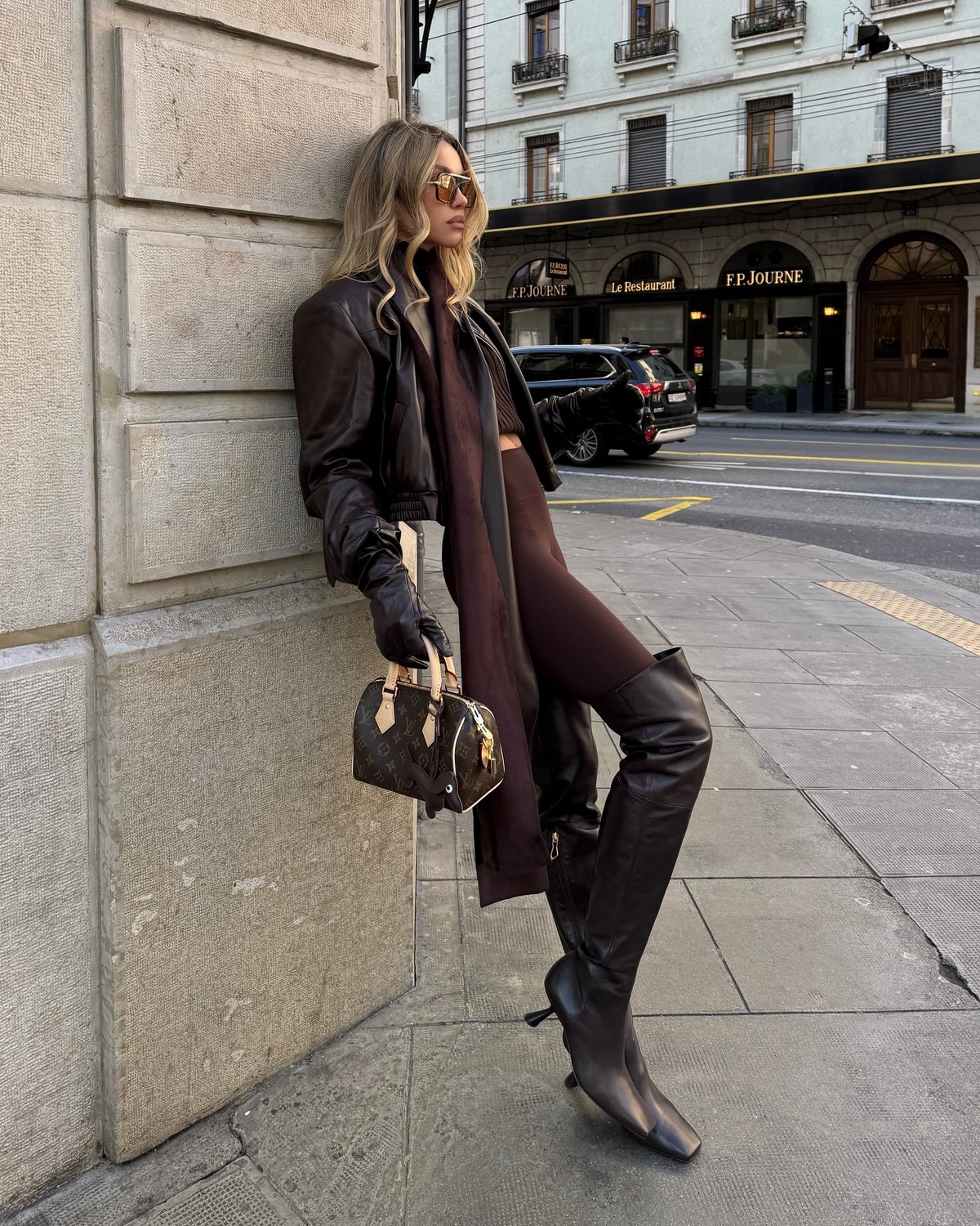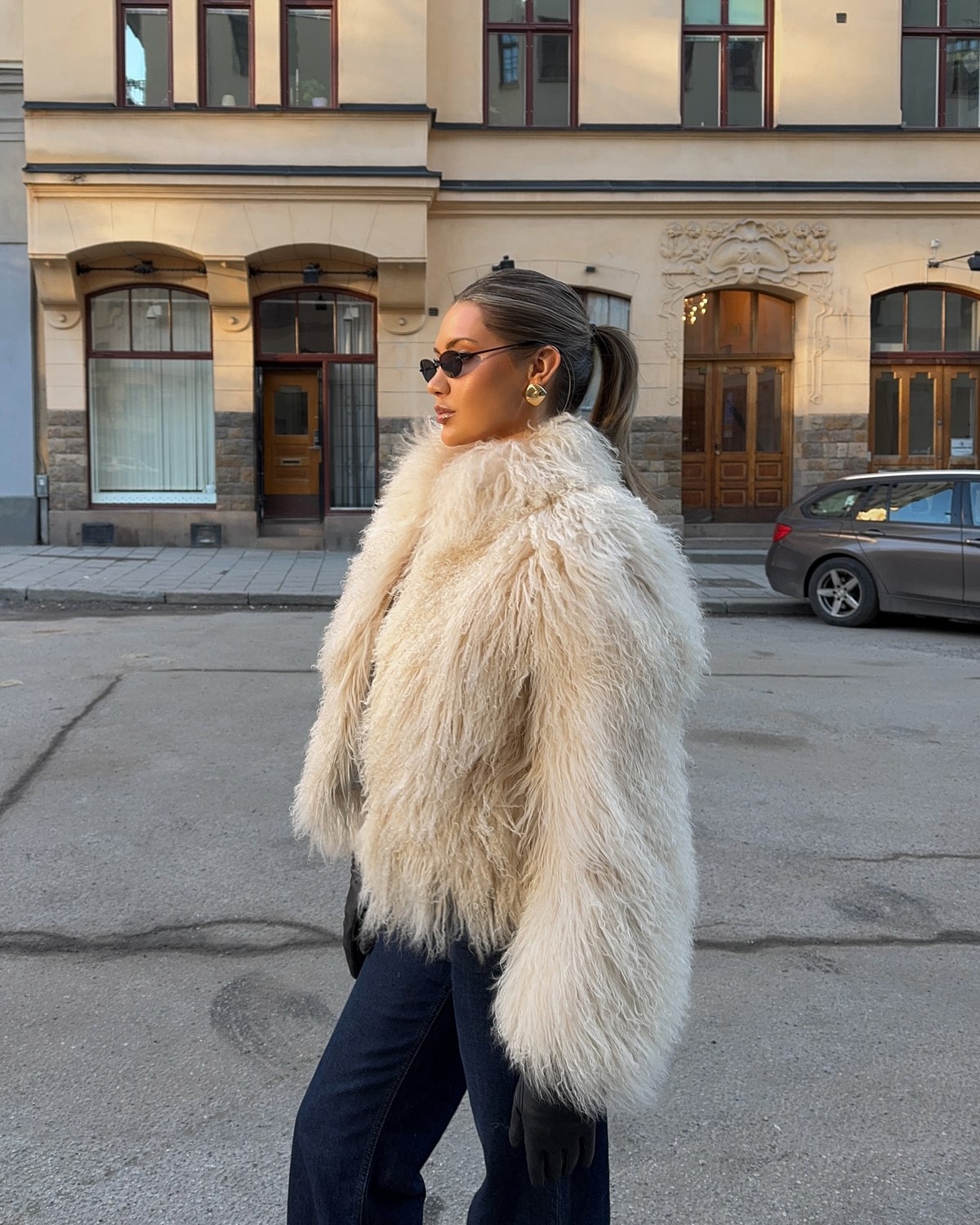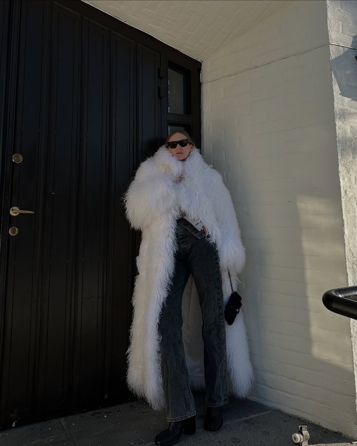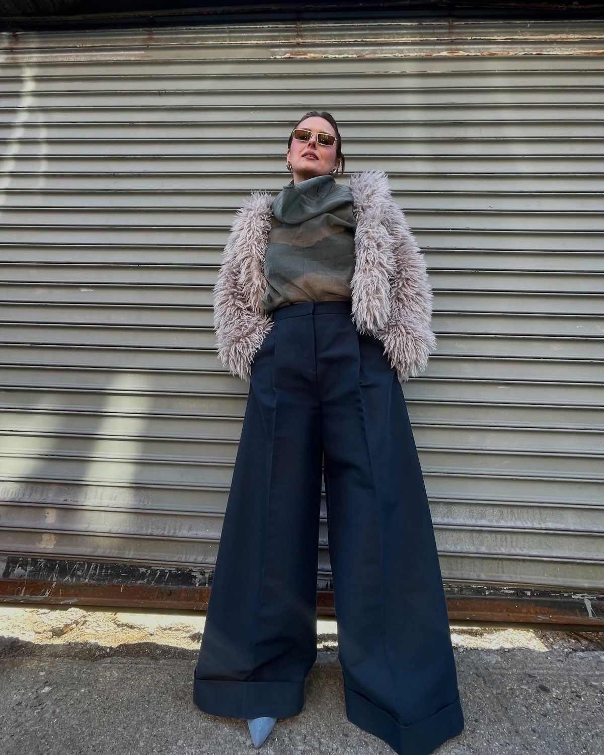 - Фактуры: кожа, замша, деним с эффектом потертости, мех — как натуральный, так и искусственный. Популярна многослойность с разными текстурами.