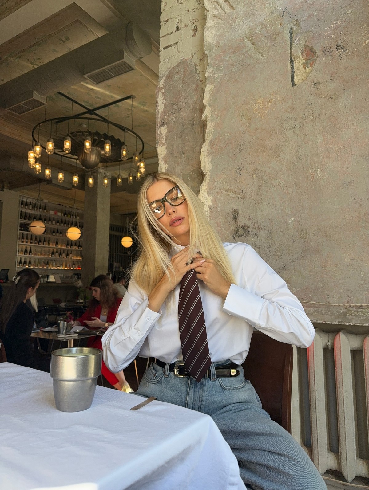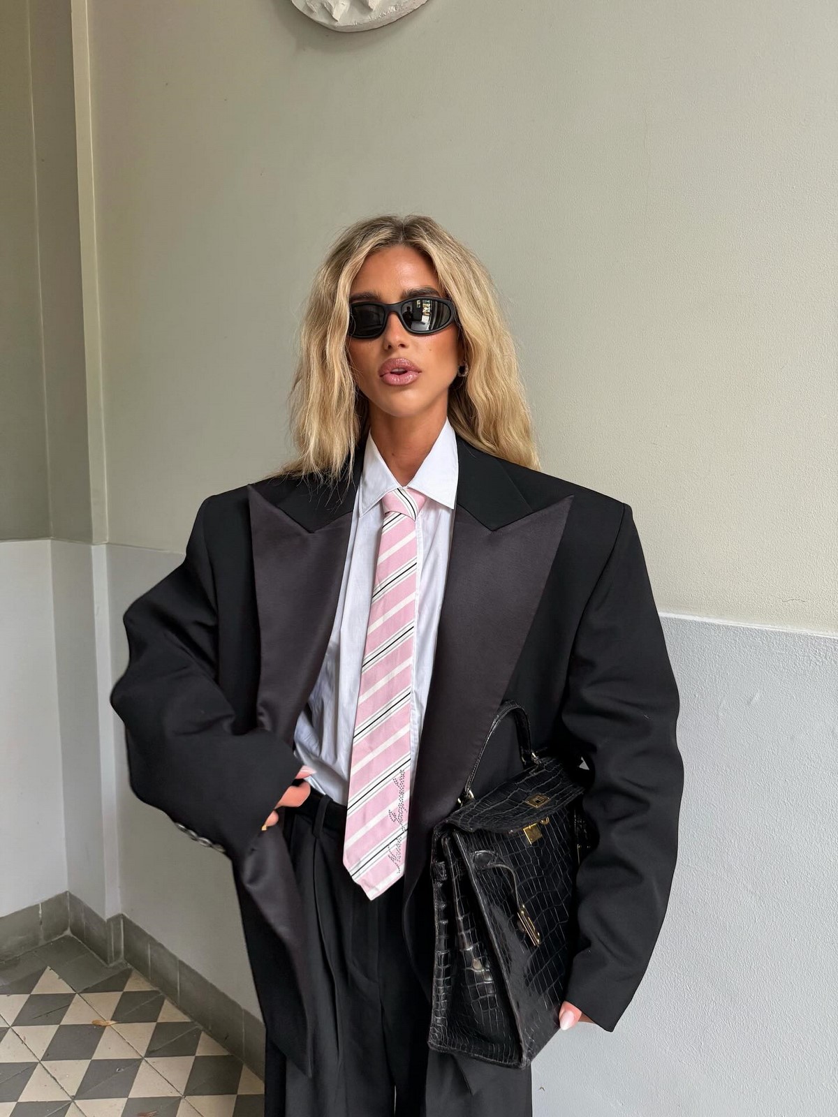 Элемент мужского гардероба стал женской визитной карточкой. Галстук носят с классическими костюмами, платьями-рубашками и даже в дуэте с кардиганом.