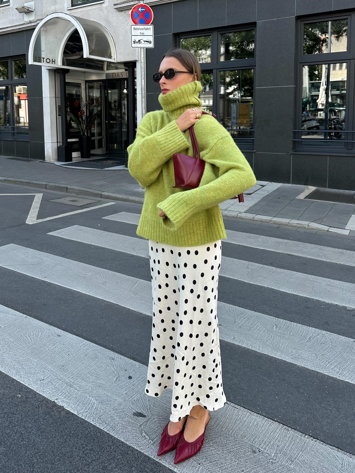 Ретро-принт вновь в тренде: от платьев до курток. Горох хорошо работает как акцент, особенно на темном фоне, и добавляет женственности строгим зимним образам.