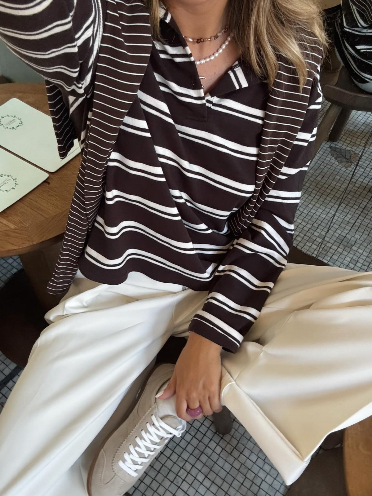 Полоска на костюмах, поло и лонгсливах задает динамику образу. Вертикальная — визуально вытягивает силуэт, а диагональная добавляет спортивного шарма.