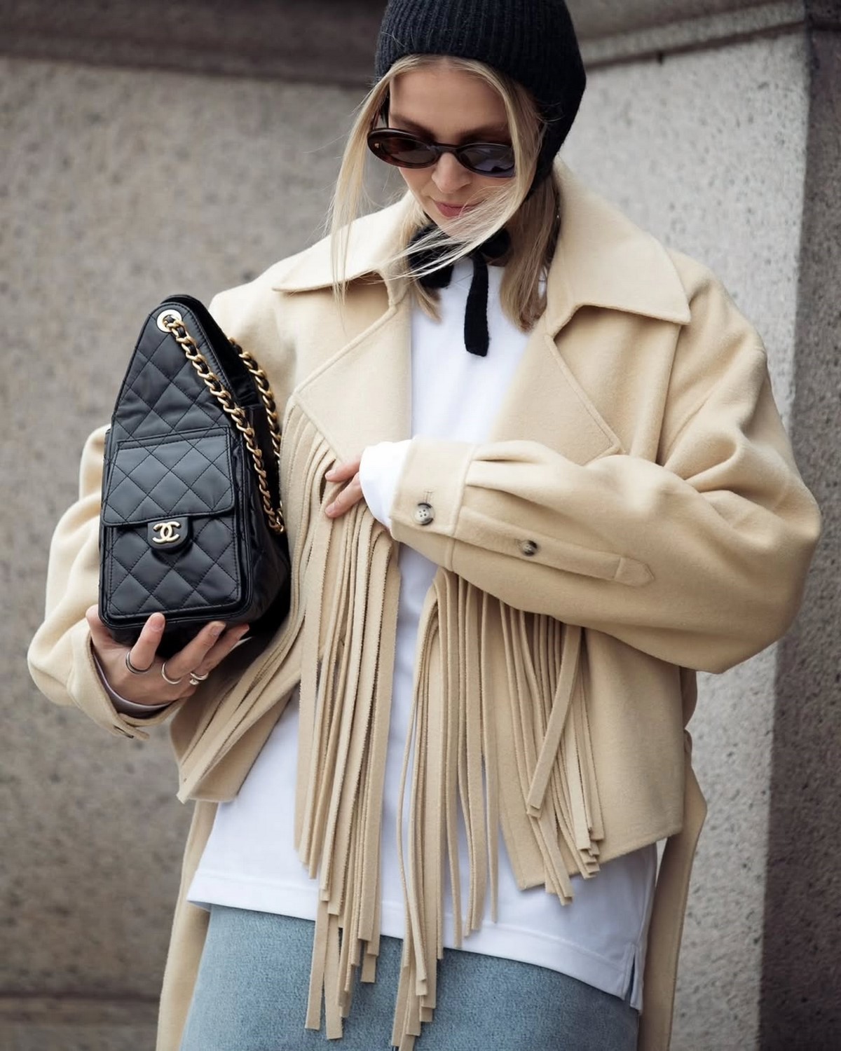Бахрома возвращается в новом прочтении: замшевые куртки, пальто и сумки выглядят ультрамодно с этим акцентом. Она добавляет движения и подчеркивает индивидуальность.