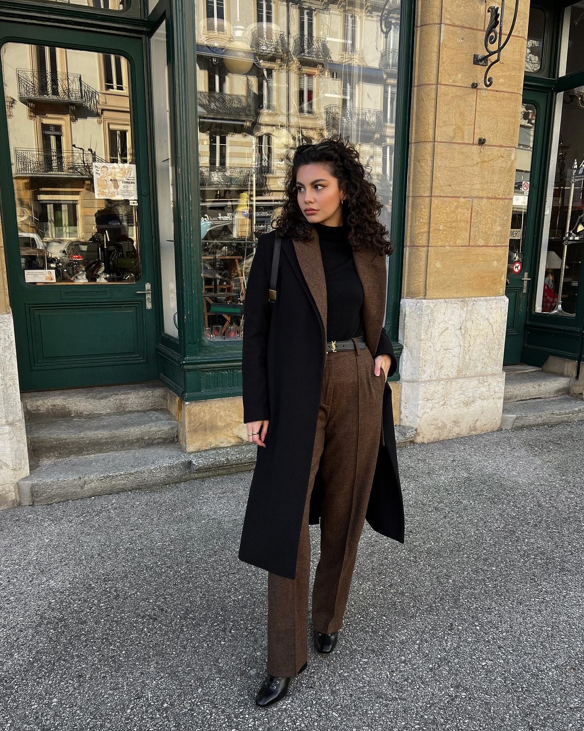 - Цвета: на пике популярности шоколадные оттенки, карамель, глубокий красный, сливовый, серо-голубой и графит. Белый сохраняет позиции в виде тотал-луков.