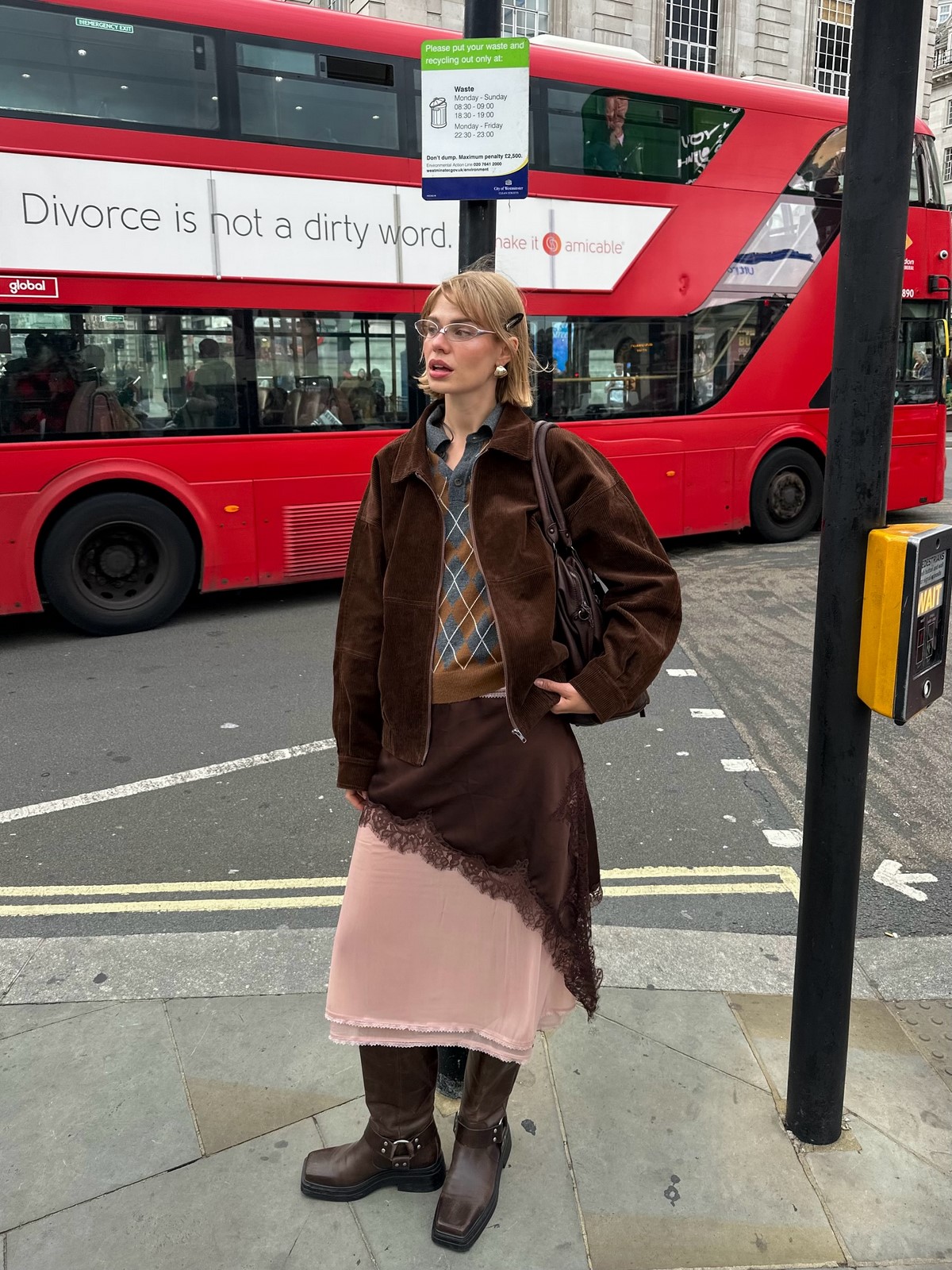 Сатиновые и шелковые платья с кружевом стали частью зимних образов. Их носят с массивными свитерами, пальто и ботфортами, создавая эффект многослойности.