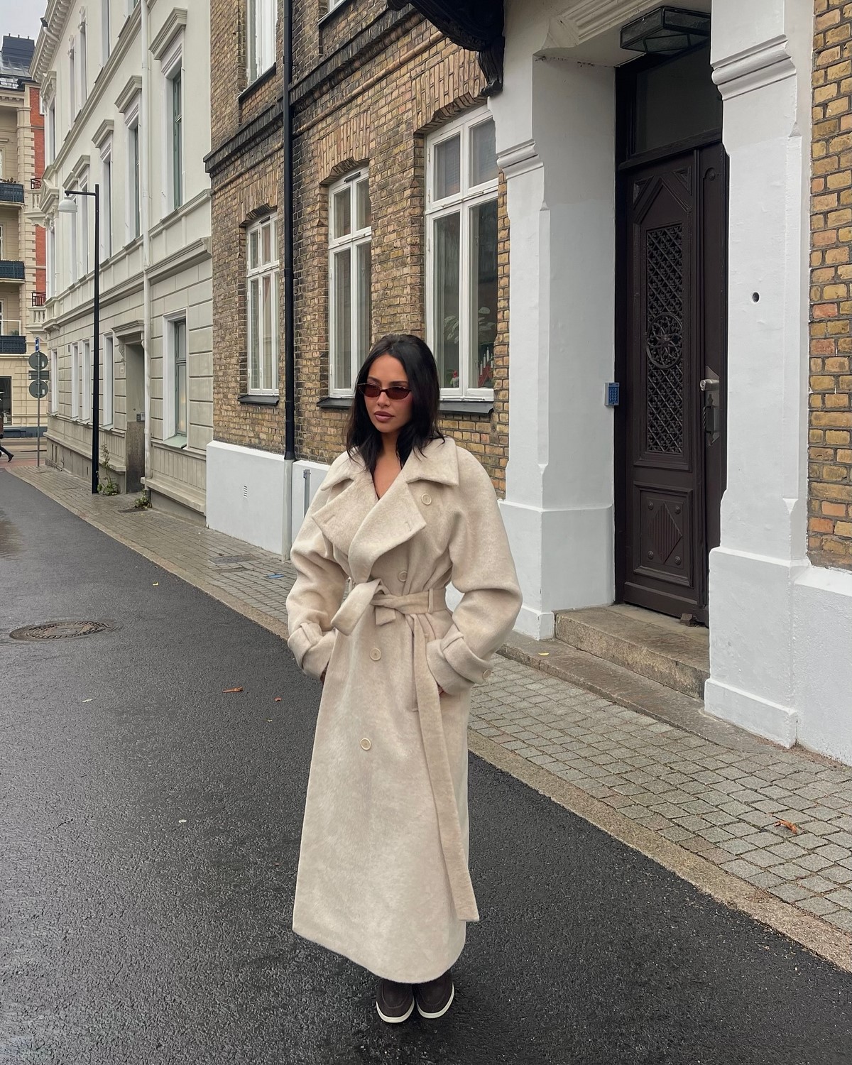 - Силуэты: свободные пальто, оверсайз-костюмы, удлиненные свитеры и платья в бельевом стиле. Вновь возвращаются акцентные плечи и объемные рукава.