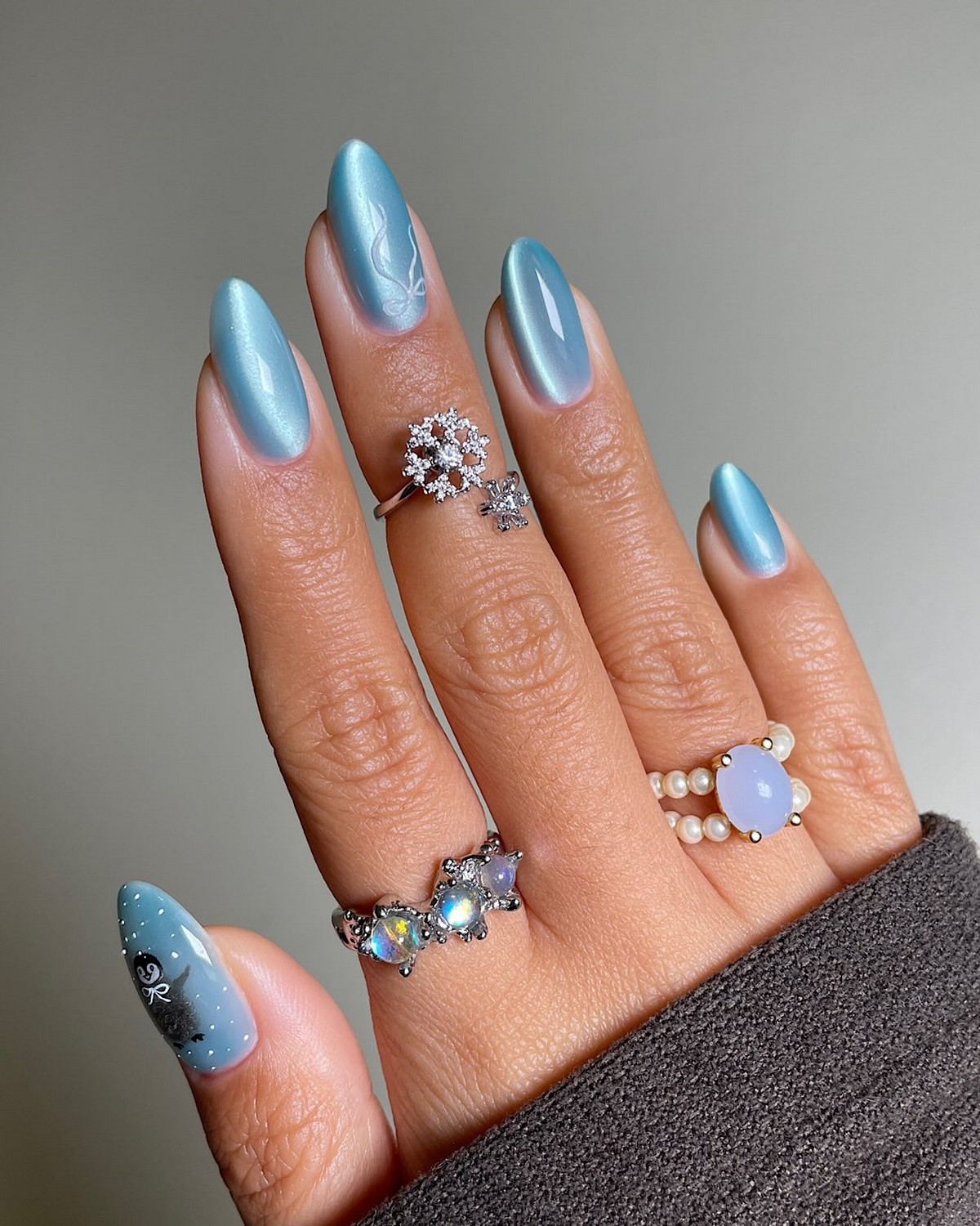 Длинный миндаль зимой 2026 года остается символом утонченности и женственности. Эта форма идеально подходит для однотонных покрытий в холодной палитре, а также для мягких градиентов и деликатного блеска. Миндаль визуально вытягивает пальцы и отлично смотрится в сочетании с перламутром, втиркой и минималистичными зимними узорами.