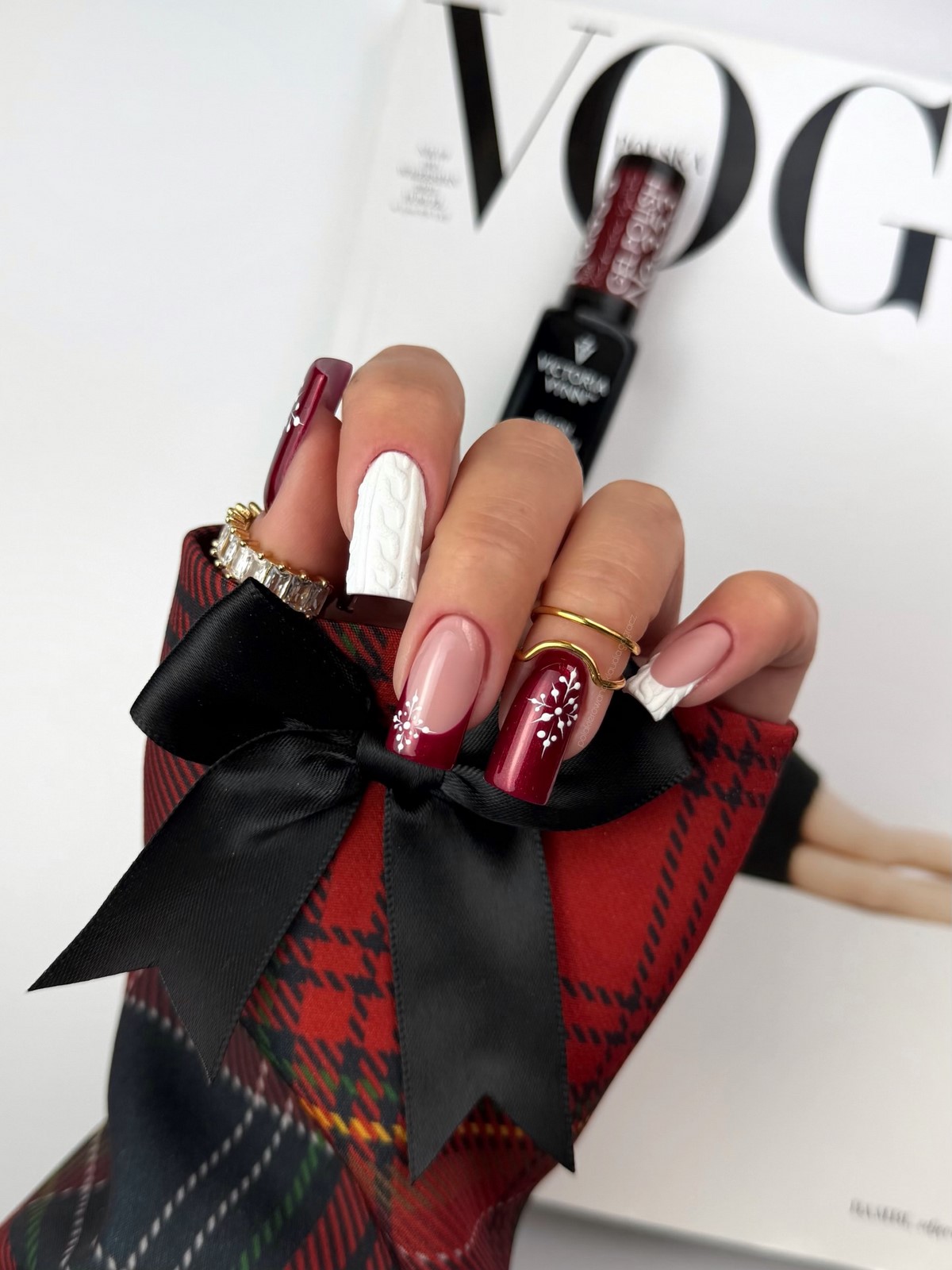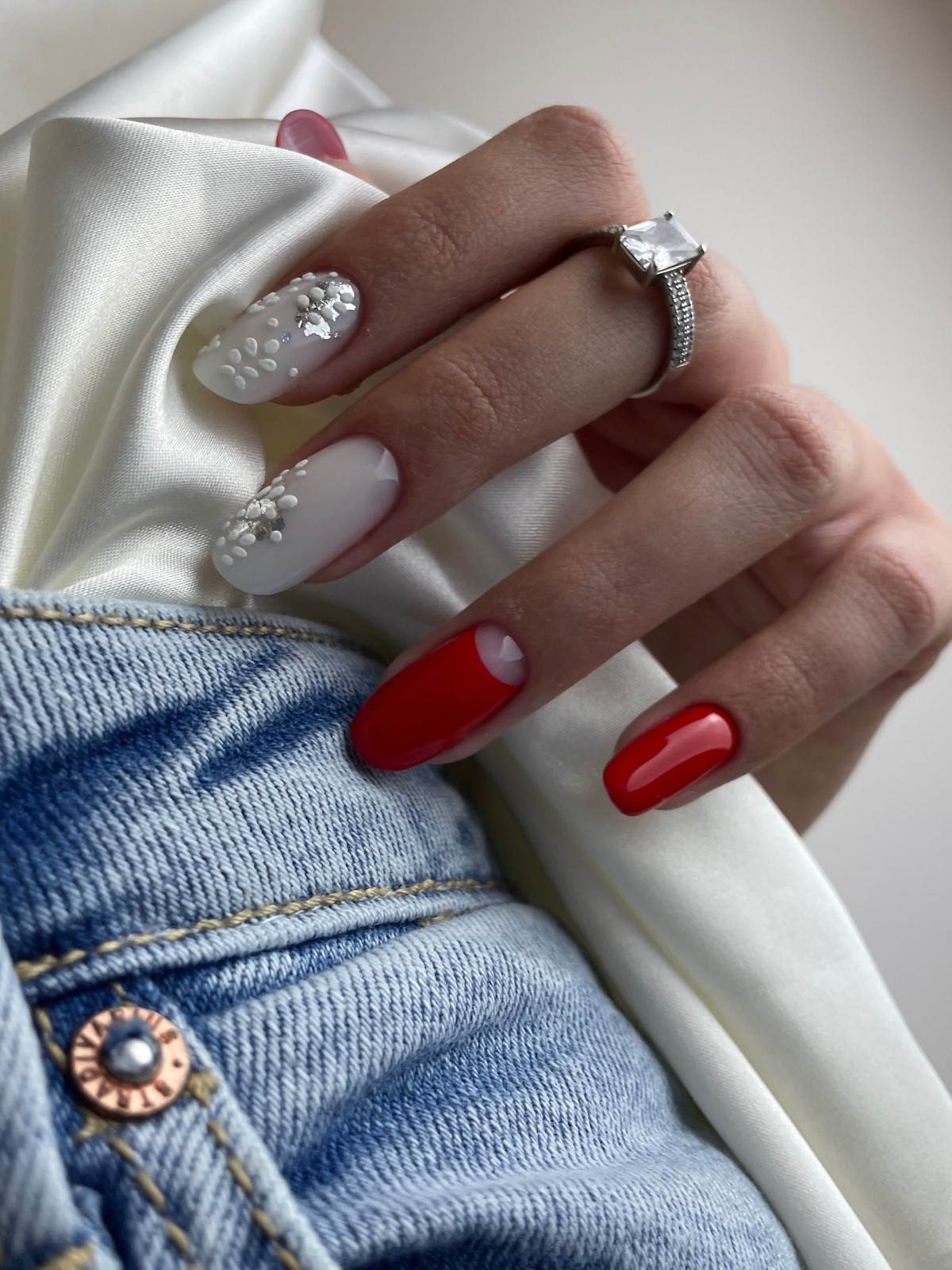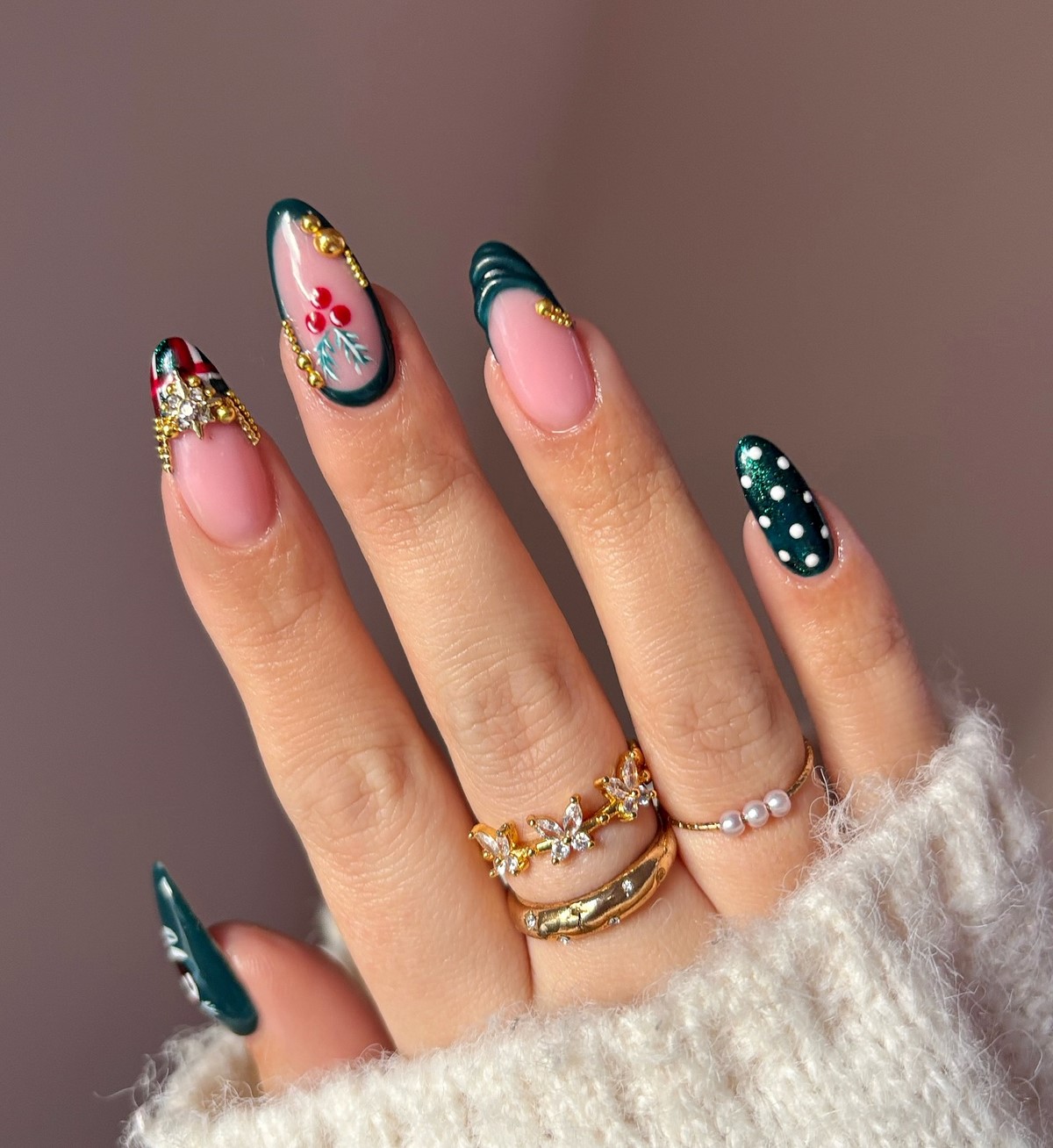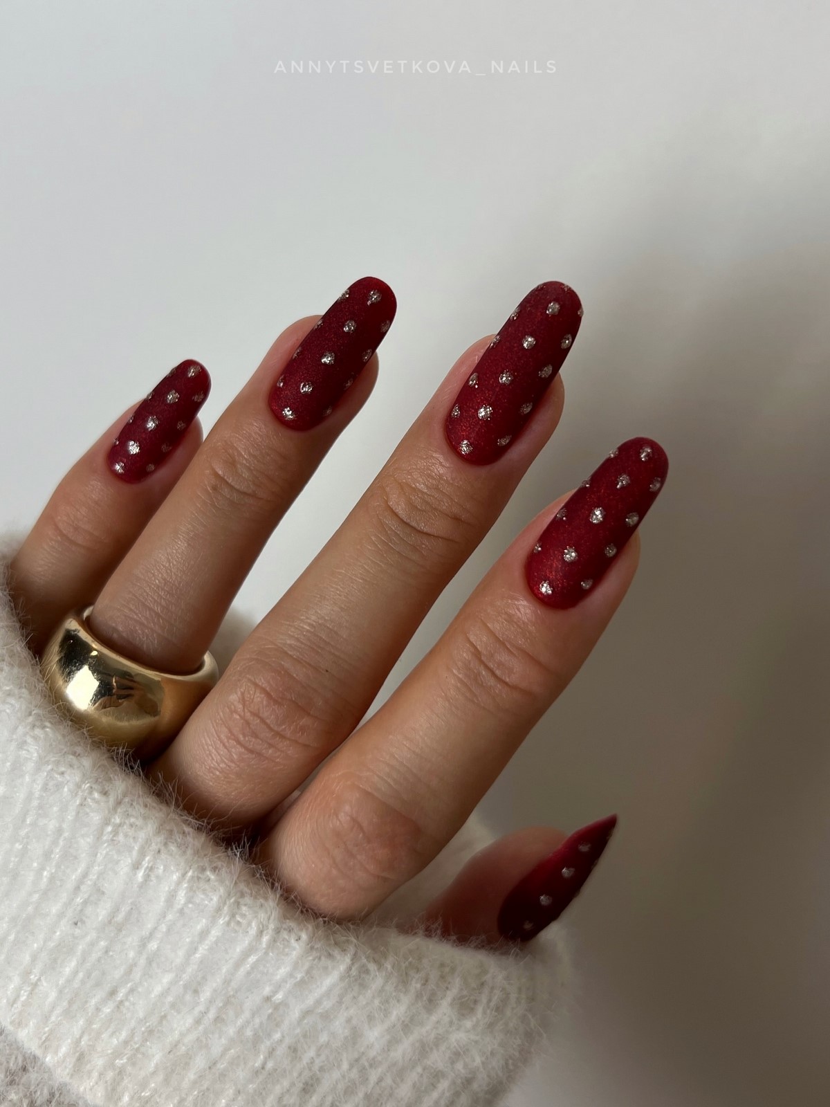 Этот вариант отлично подходит для длинных ногтей, так как позволяет равномерно распределить декор и сохранить баланс. Красный с горошком идеально вписывается в зимние образы с трикотажем, шерстью и плотными тканями.
