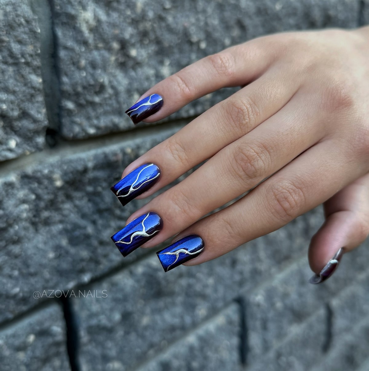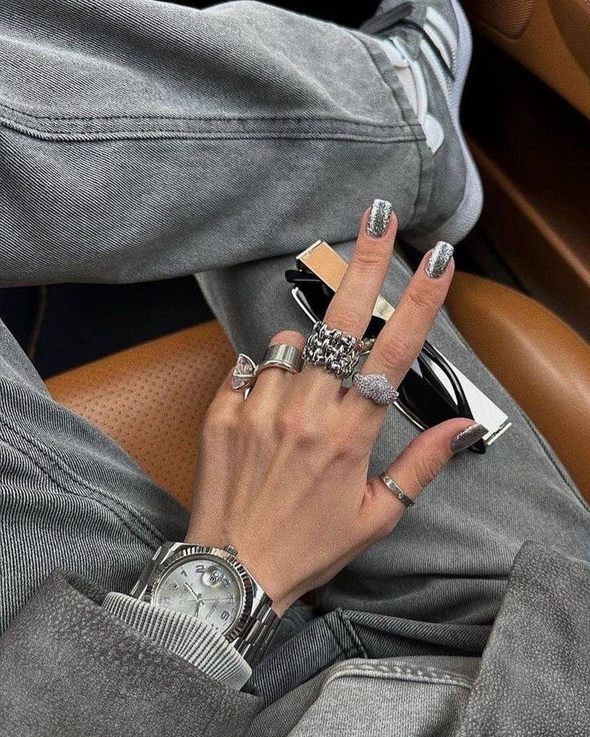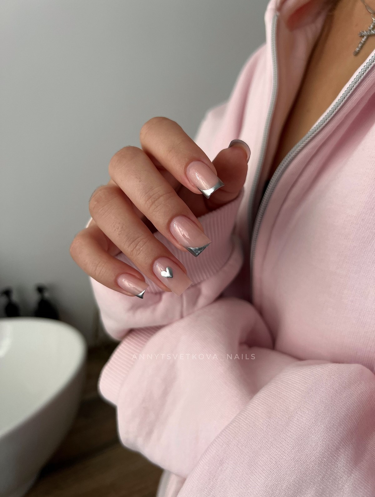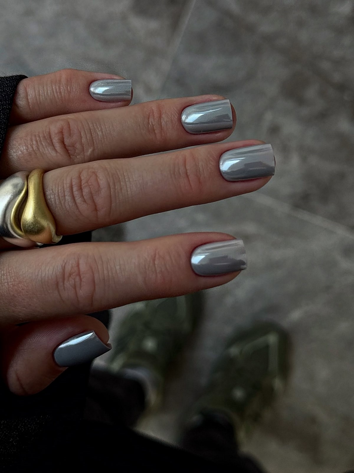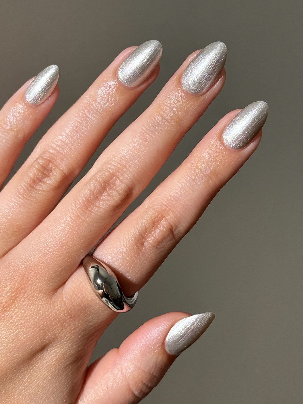 Металлический блеск — фаворит зимы 2025-2026. Серебристые, платиновые и хромированные покрытия отражают свет, создавая эффект «зеркала» на ногтях. Такой маникюр идеально подходит к вечерним образам, но при правильном сочетании может быть уместен и в повседневности. Особенно актуален в виде акцента на одном-двух ногтях, либо в комбинации с нюдовой базой.
