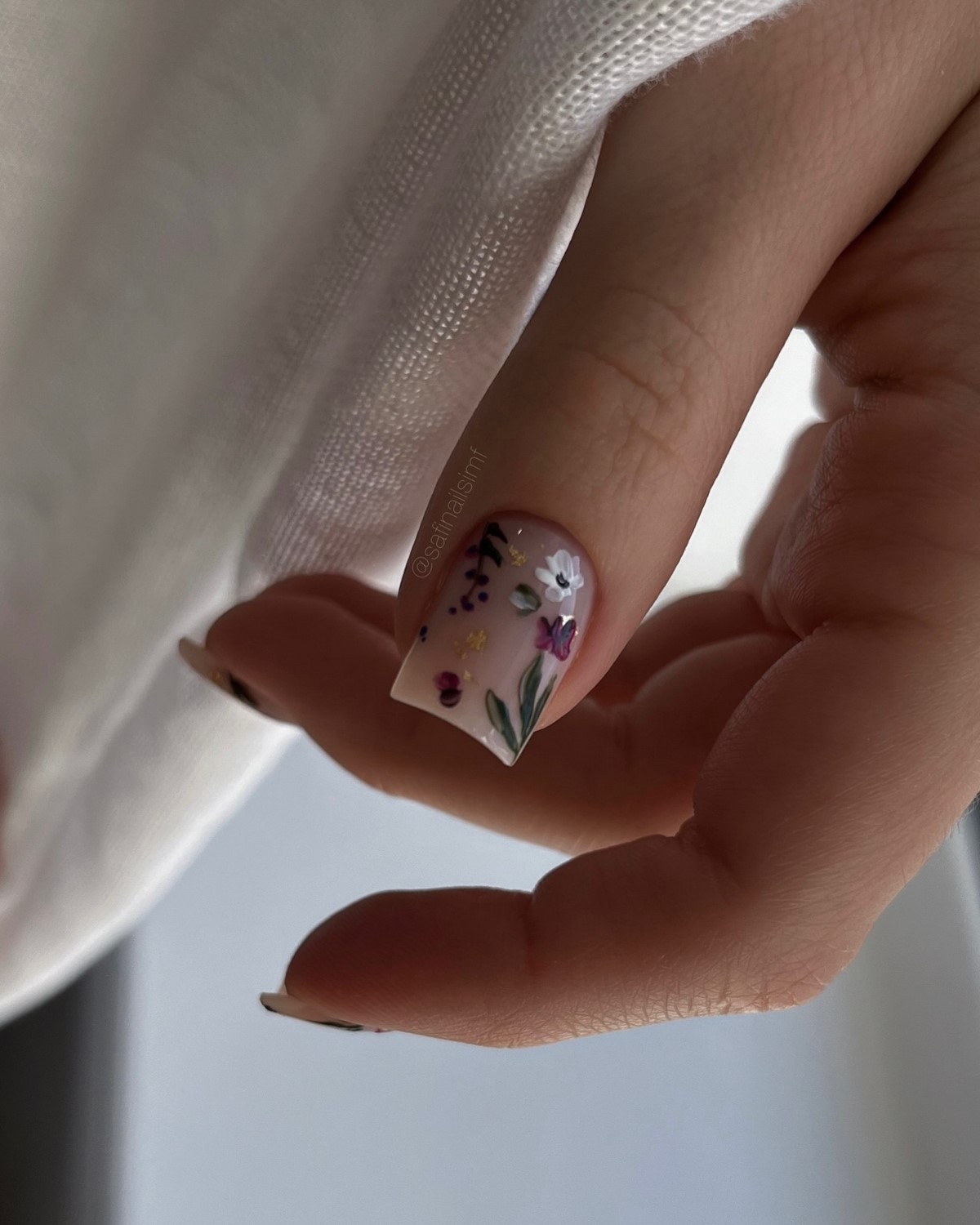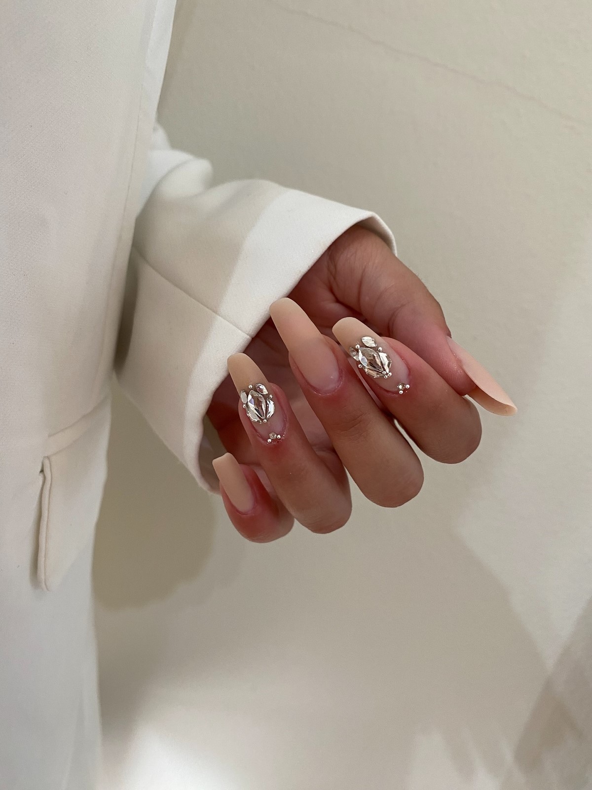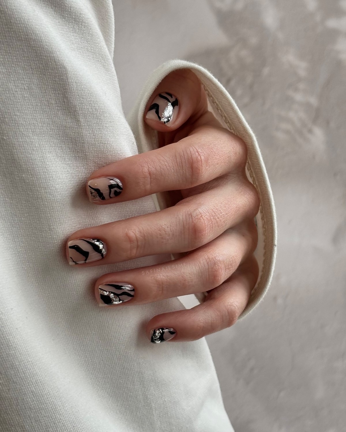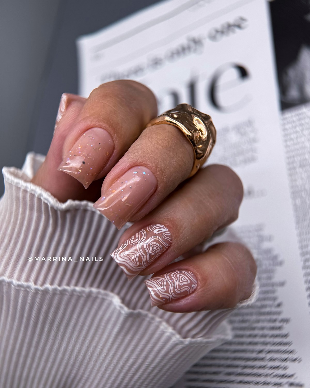 Классический нюд не теряет актуальности, но зимой 2025-2026 он обновляется за счет деталей. На нюдовой базе мастера используют стемпинг — тонкие графичные рисунки, зимние орнаменты или минималистичные геометрические узоры. Такой маникюр смотрится нежно и стильно, идеально подходит для офисного дресс-кода и при этом не выглядит скучно.