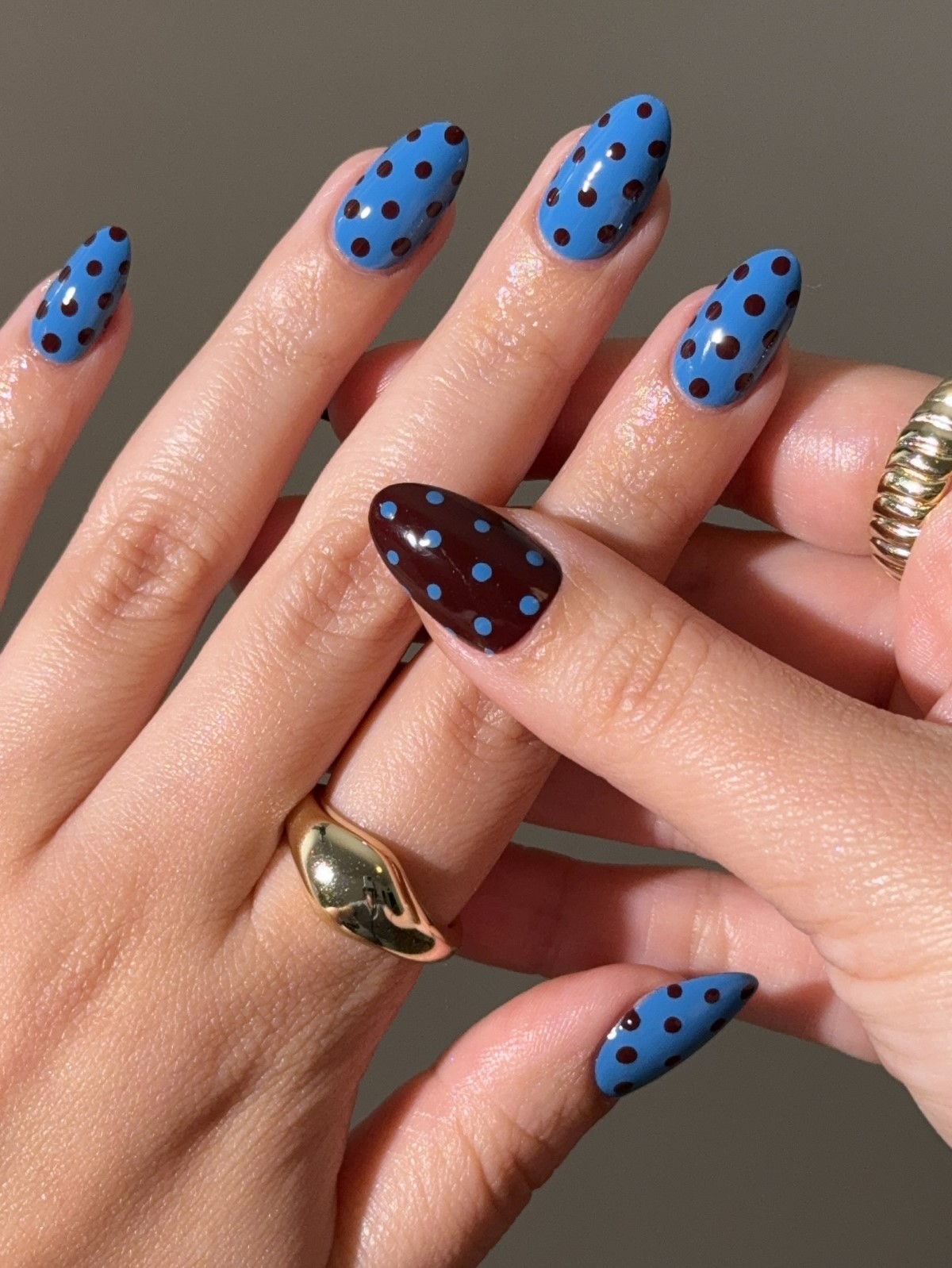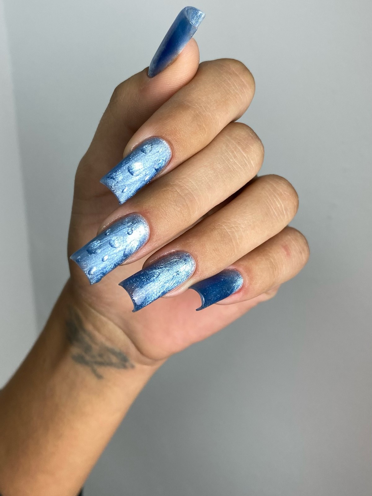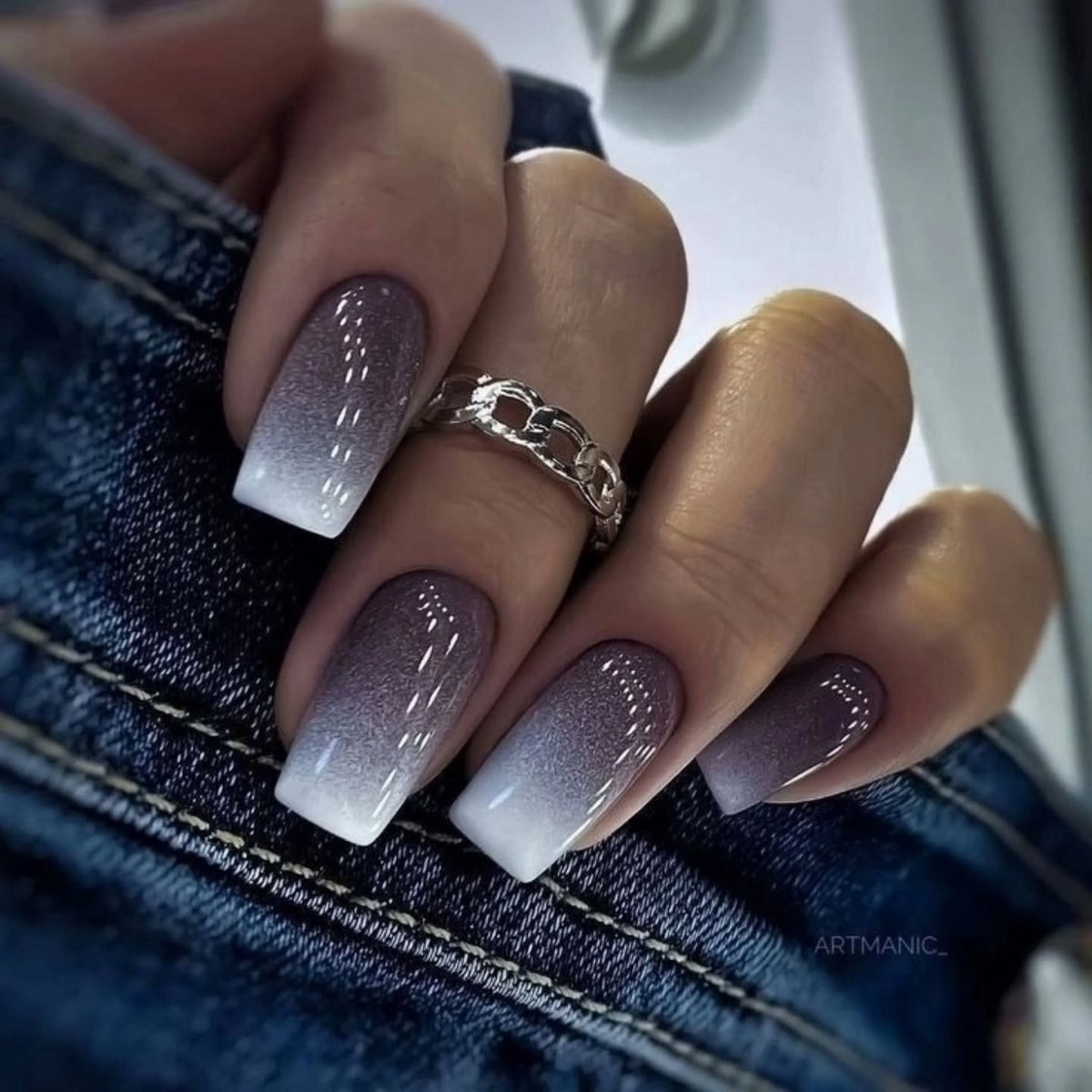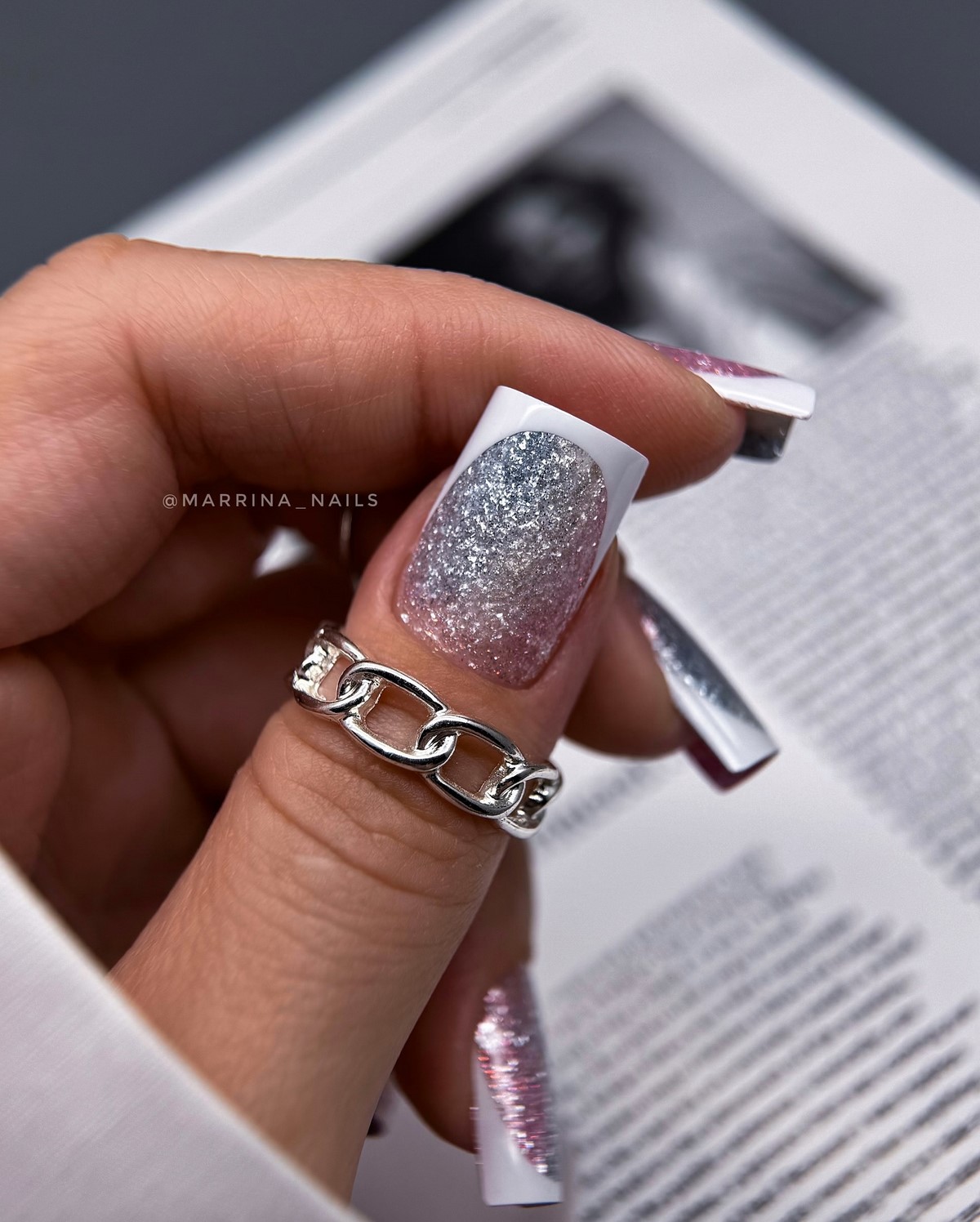 Зимой без блесток не обойтись: они создают атмосферу праздника. В тренде как полное покрытие глиттером, так и акцентное нанесение на кончик ногтя (в духе «снежного градиента»). Особенно эффектно смотрятся серебряные, голубые и золотые блестки, а также комбинация разных текстур — матовой базы и сияющего топа.
