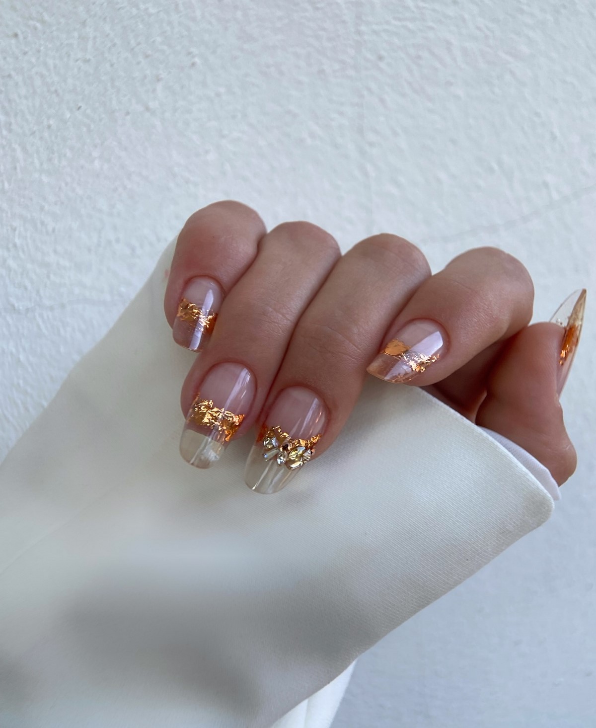 - Декор: блестки, фольга, стразы, перламутровые втирки, хром-пудра.