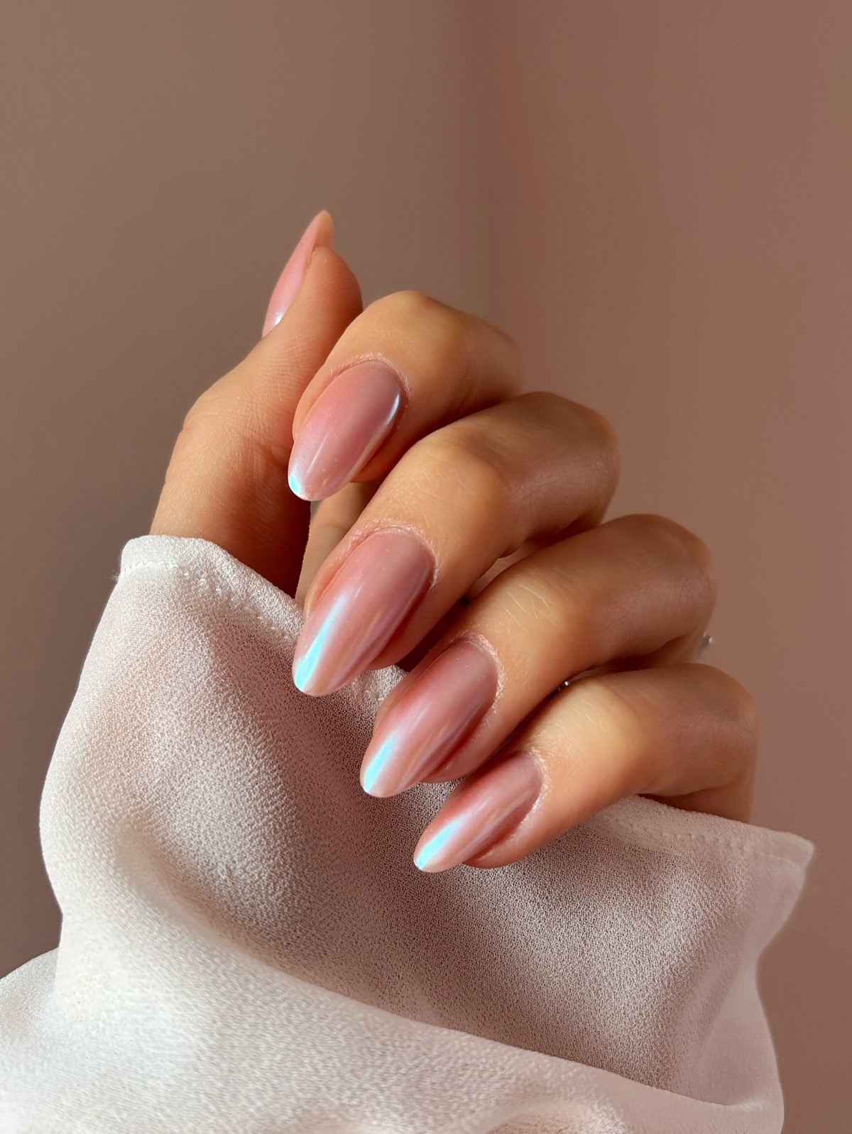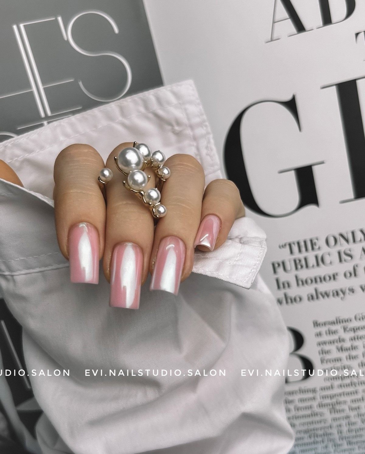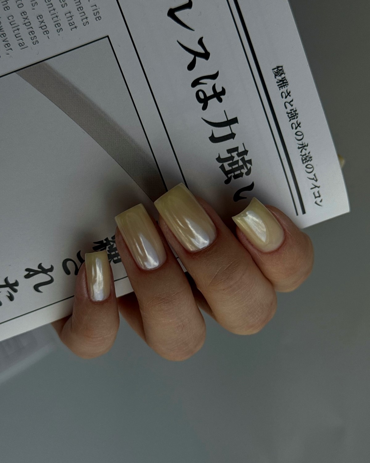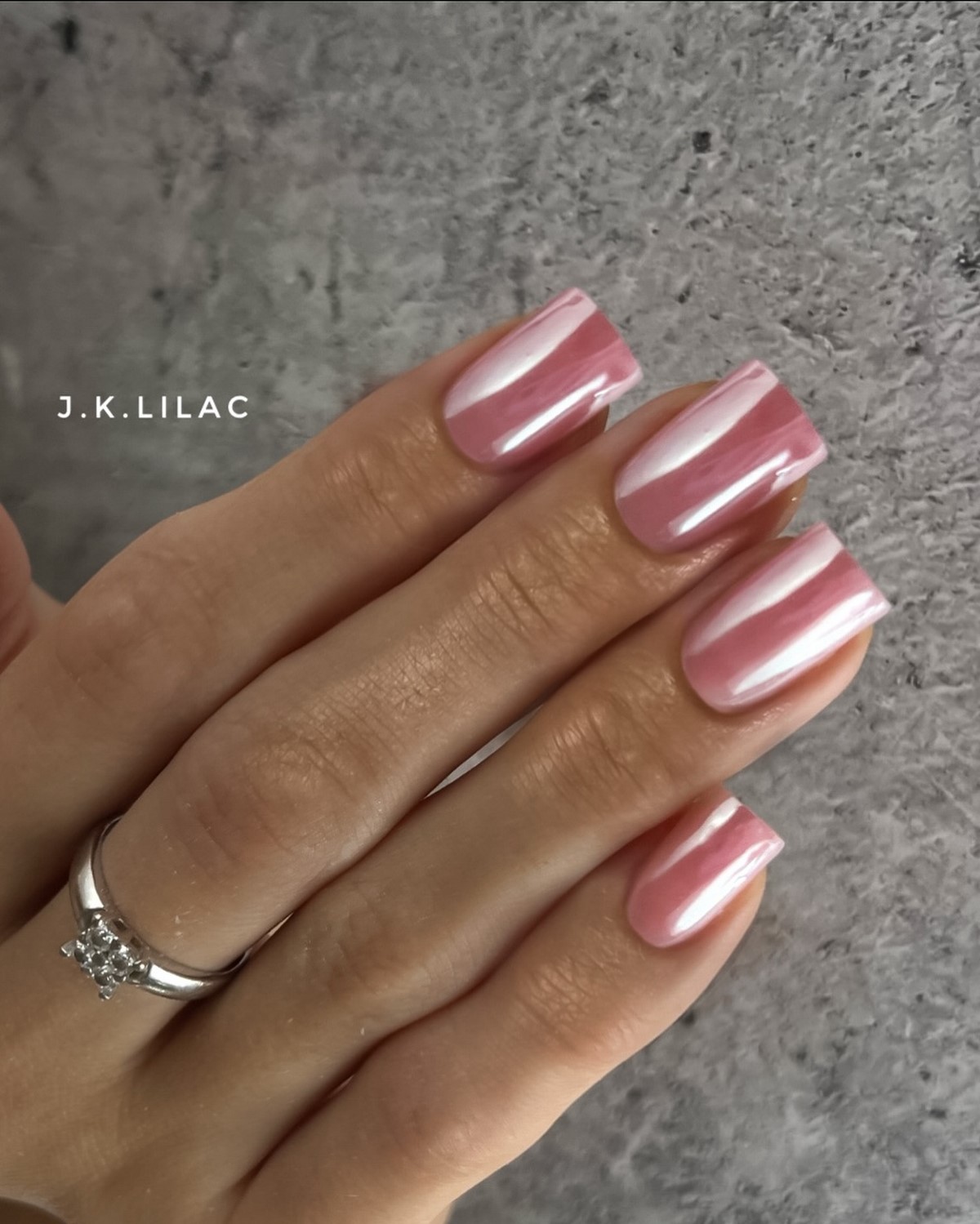 Создать глазированный эффект можно несколькими способами. Самый популярный метод — использование специальных гель-лаков с жемчужным или перламутровым шиммером в сочетании с глянцевым топом. Мастера также применяют технику наслоения полупрозрачных оттенков: сначала наносится базовый нюдовый или молочный тон, затем добавляется слой с микроблестками или шиммером, и завершается все глянцевым топовым покрытием. Для усиления эффекта некоторые nail-мастера используют специальную втирку или пигменты, которые создают характерное сияние изнутри.