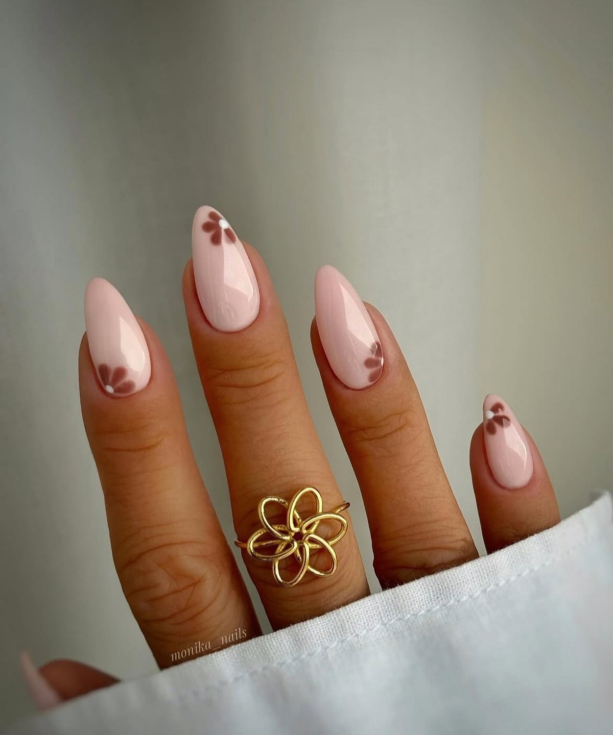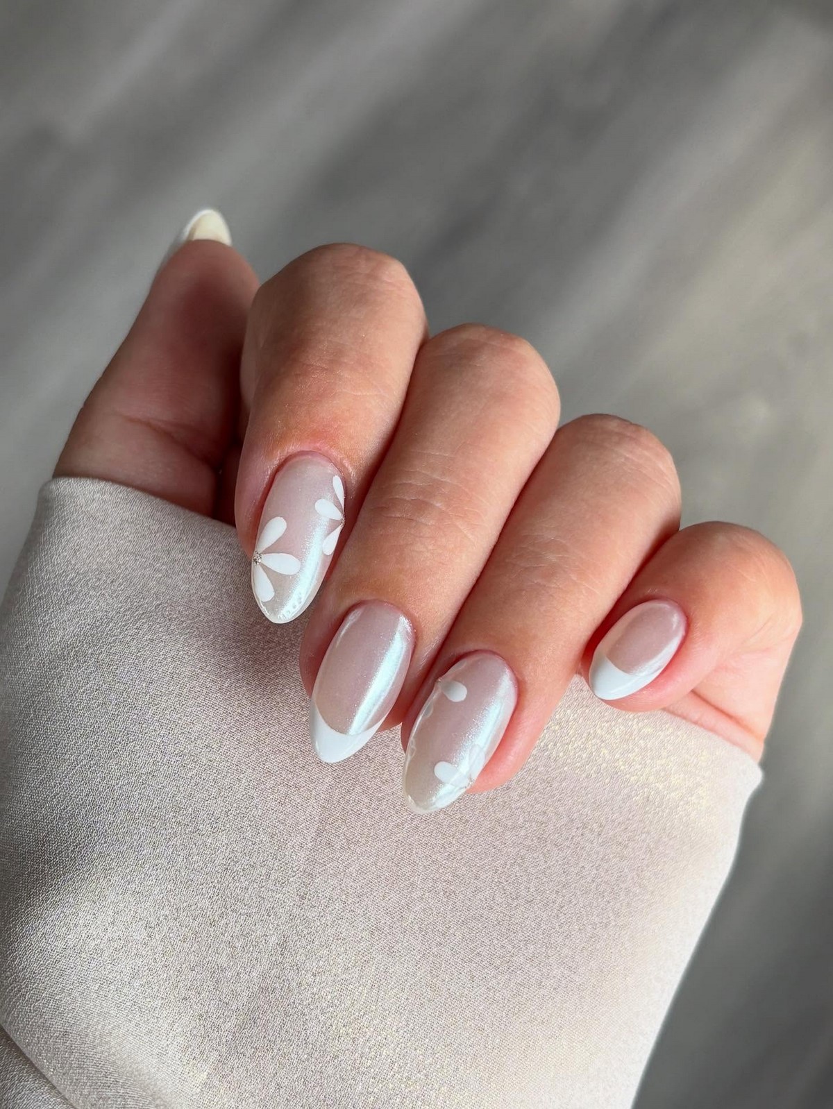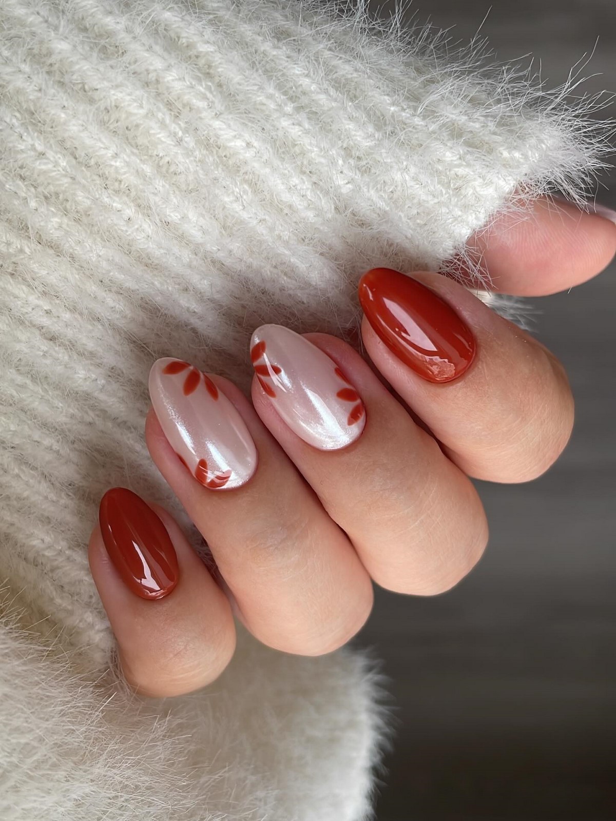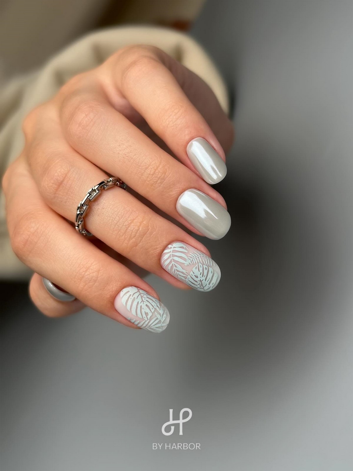 Флористические мотивы на глазированных ногтях выглядят нежно и романтично. В осенне-зимнем сезоне 2025-2026 актуальны как реалистичные изображения цветов с тщательной прорисовкой деталей, так и стилизованные, почти графичные варианты. Особенно красиво смотрятся цветочные композиции в приглушенных, пыльных оттенках на молочно-глазированной базе. Мастера часто дополняют цветочный дизайн золотыми или серебряными контурами, что добавляет маникюру праздничности и изысканности.