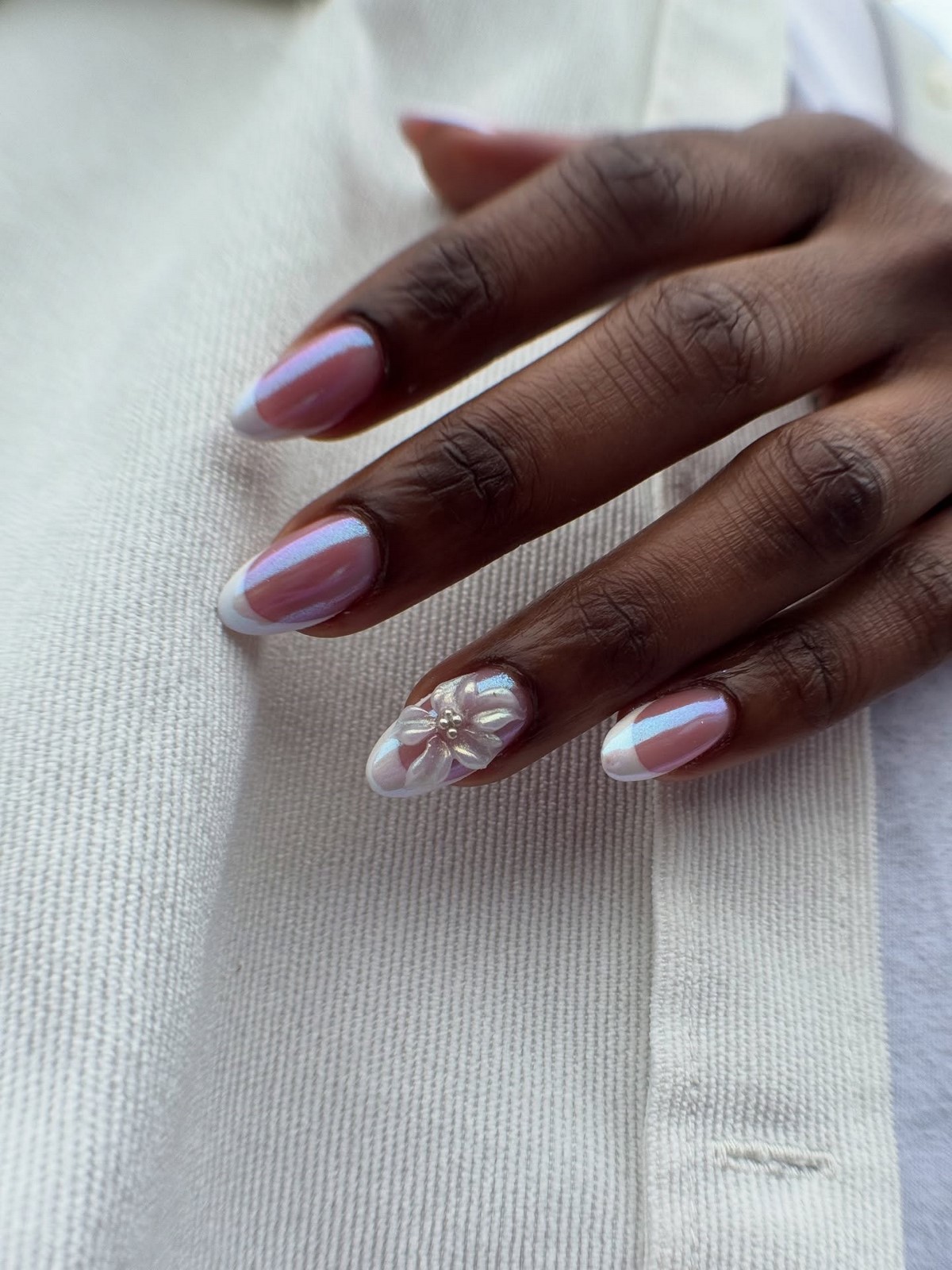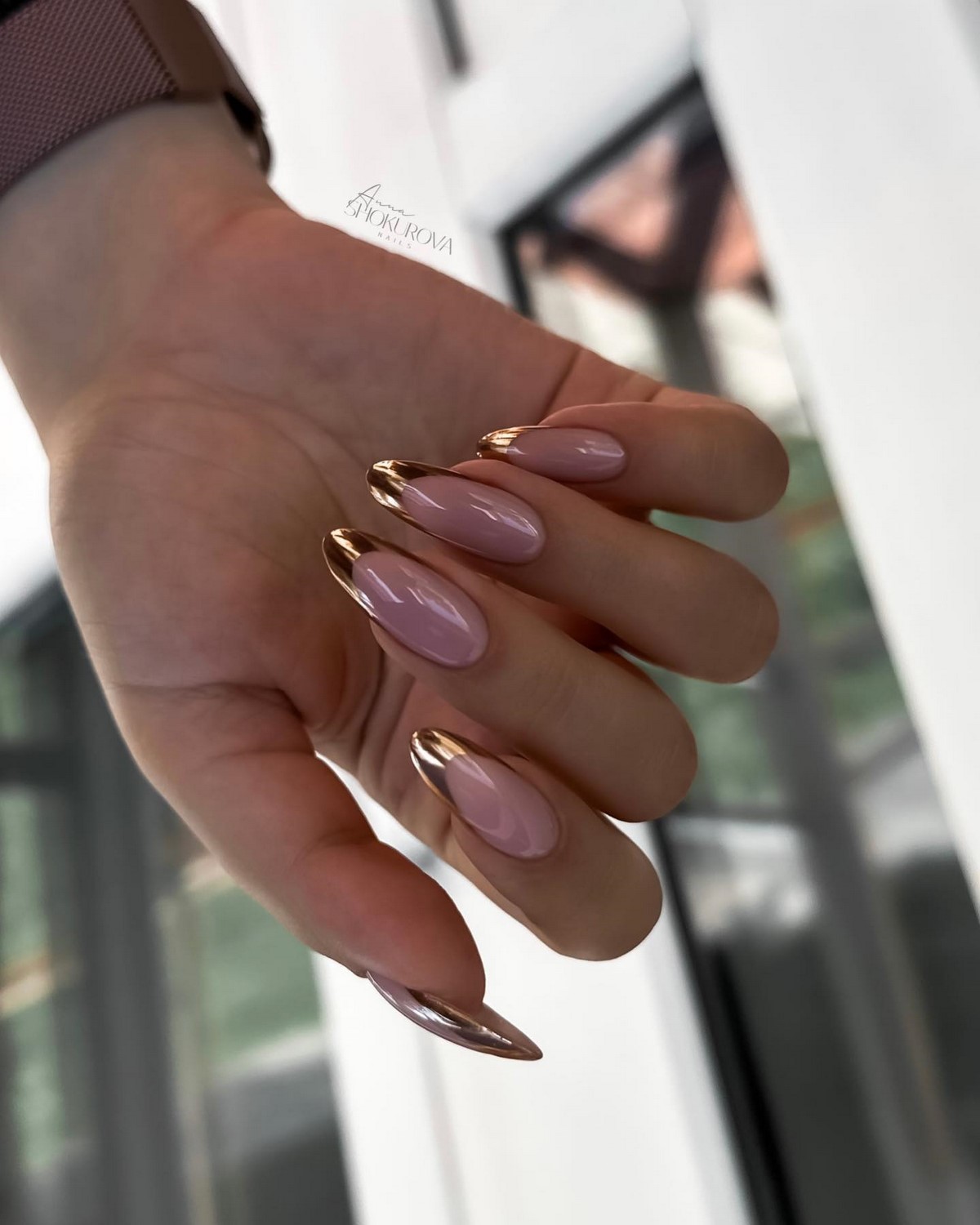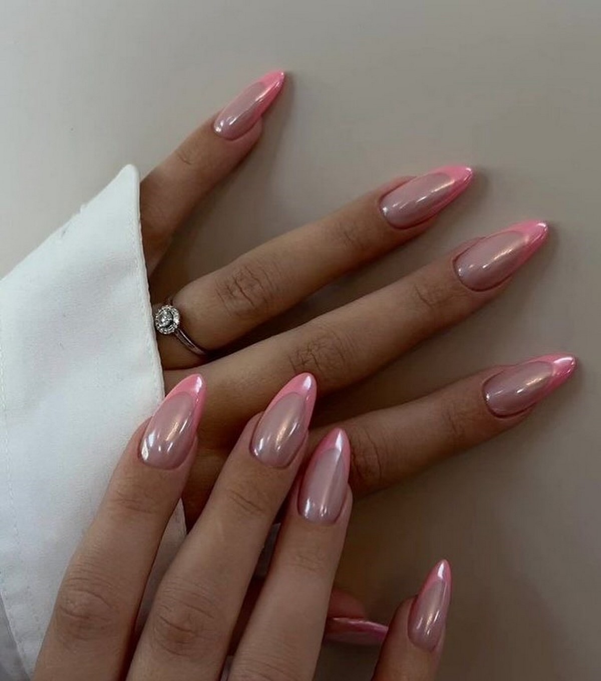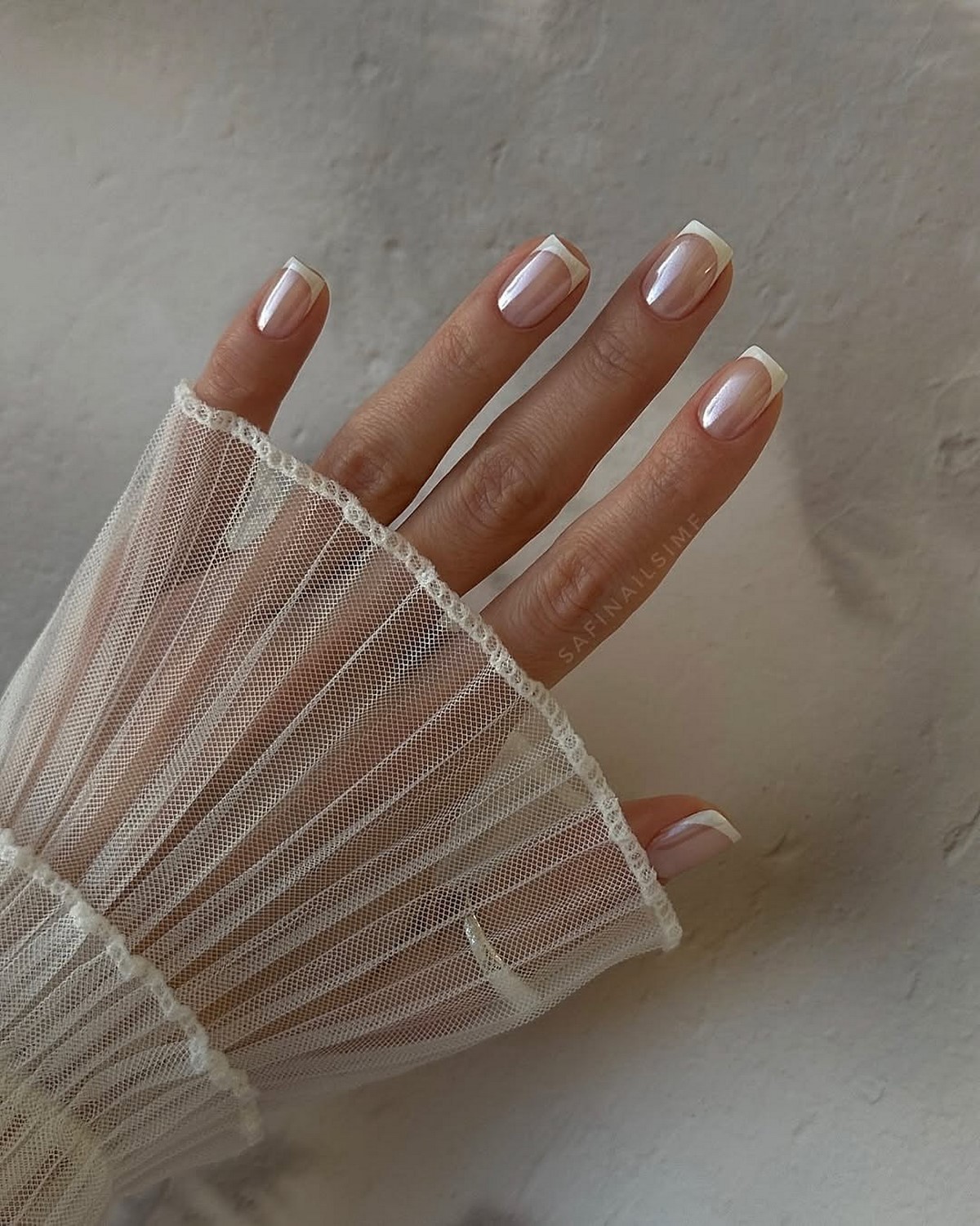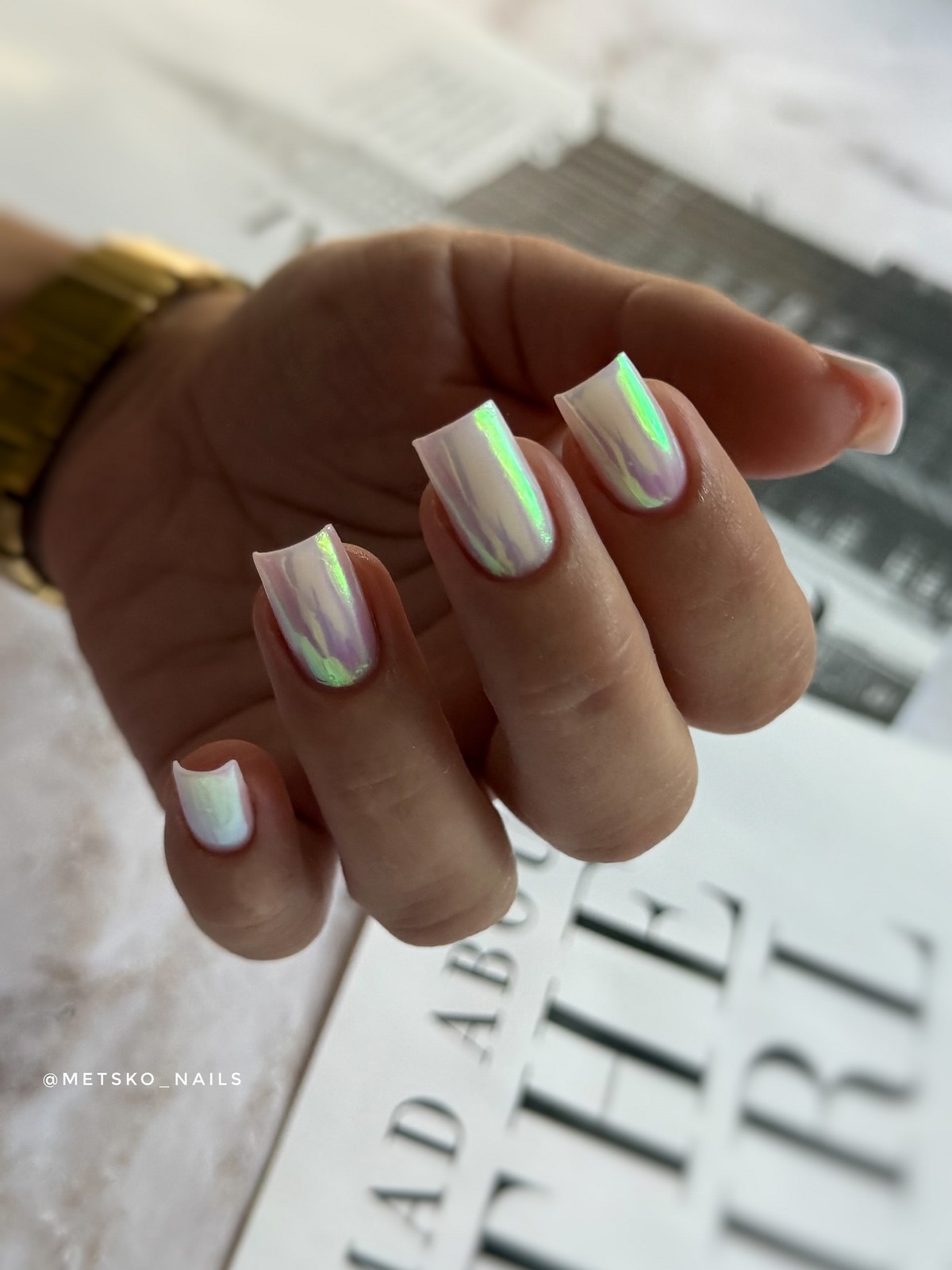 Французский маникюр с глазированным эффектом — это ода классике с современным твистом. Вместо традиционного белого кончика мастера используют перламутровые, молочно-розовые или даже цветные оттенки с характерным сиянием. Линия улыбки может быть как четкой и графичной, так и размытой, создавая эффект омбре. Глазированный френч особенно хорош тем, что подходит для любой длины ногтей и формы ногтевой пластины, при этом всегда выглядит свежо и актуально.