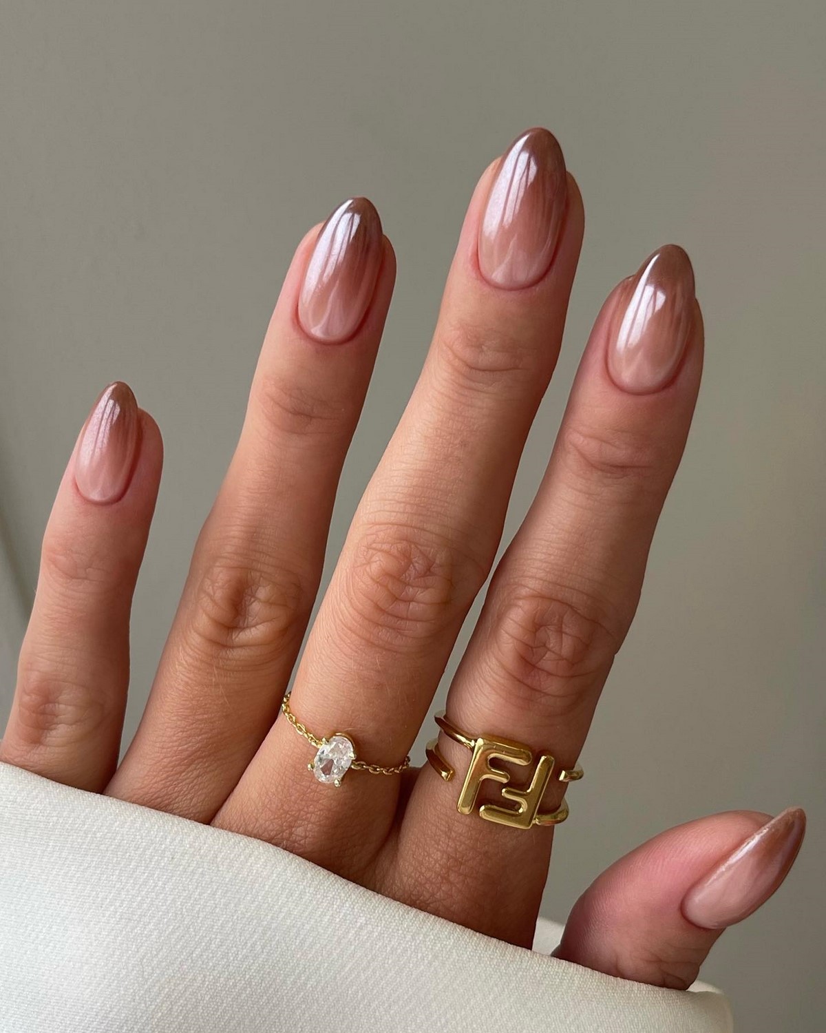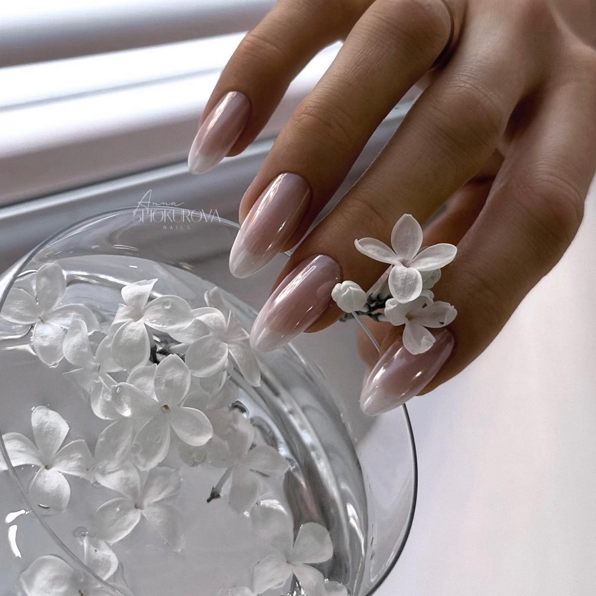 Градиентный переход на глазированных ногтях создает эффект мягкого свечения и объема. Мастера используют технику растяжки цвета от более насыщенного у основания к светлому у кончика или наоборот, что визуально удлиняет ногтевую пластину. Особенно актуальны в этом сезоне градиенты в теплых тонах — от карамельного к шоколадному, от персикового к терракотовому. Глазированный топ усиливает глубину перехода и придает дизайну дорогой, салонный вид.