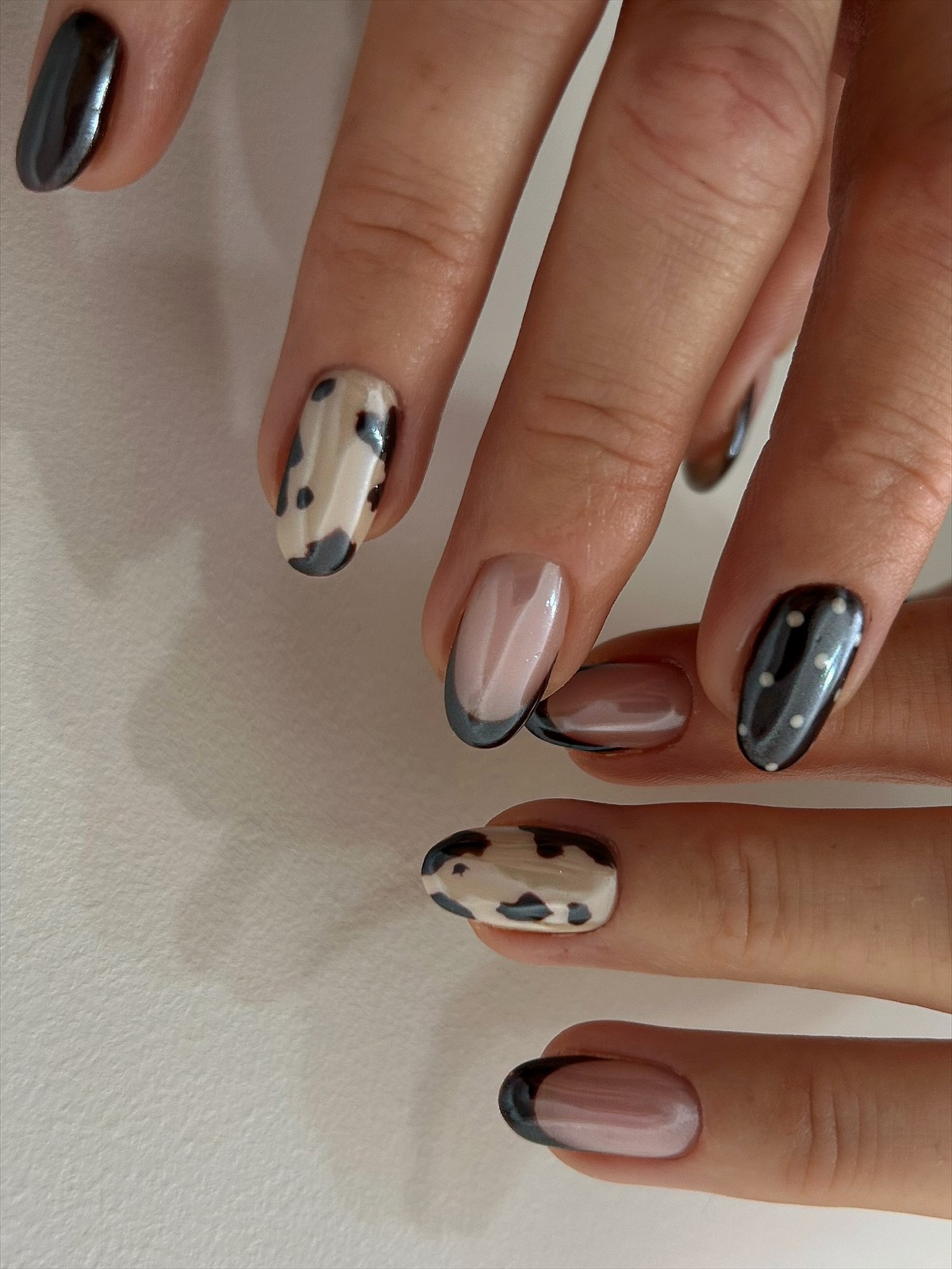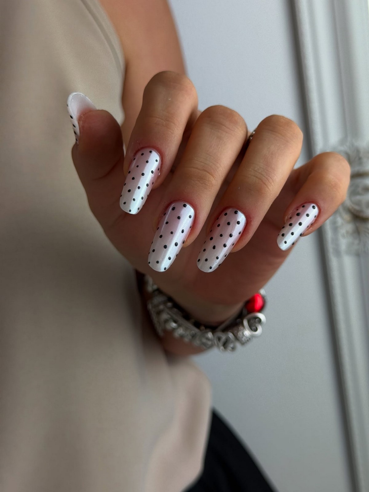 Классический горошек получает новое прочтение благодаря глазированной текстуре основы. Точки могут быть выполнены в контрастном цвете или украшены мелким шиммером для создания эффекта объема. Современная интерпретация этого ретро-мотива предполагает хаотичное расположение точек разного размера или их концентрацию на одной части ногтя. Polka dots на глазированном покрытии выглядят игриво, но при этом сохраняют элегантность и утонченность, характерную для этого типа маникюра.