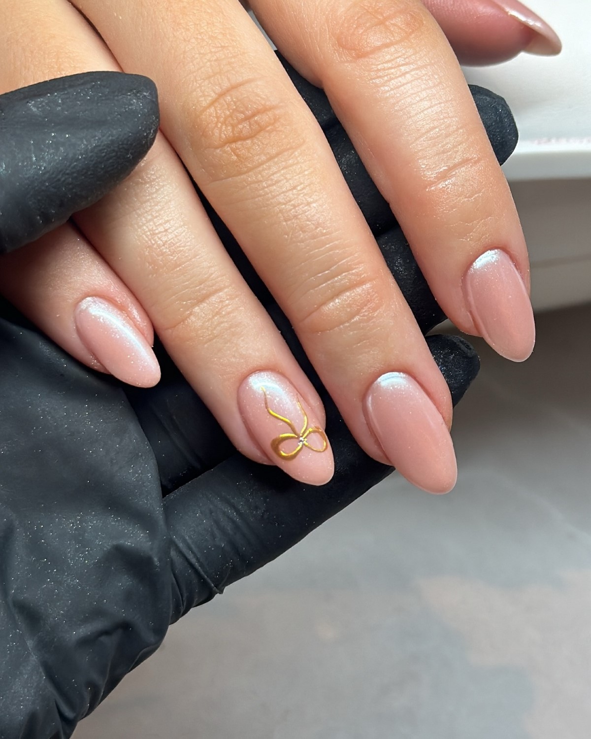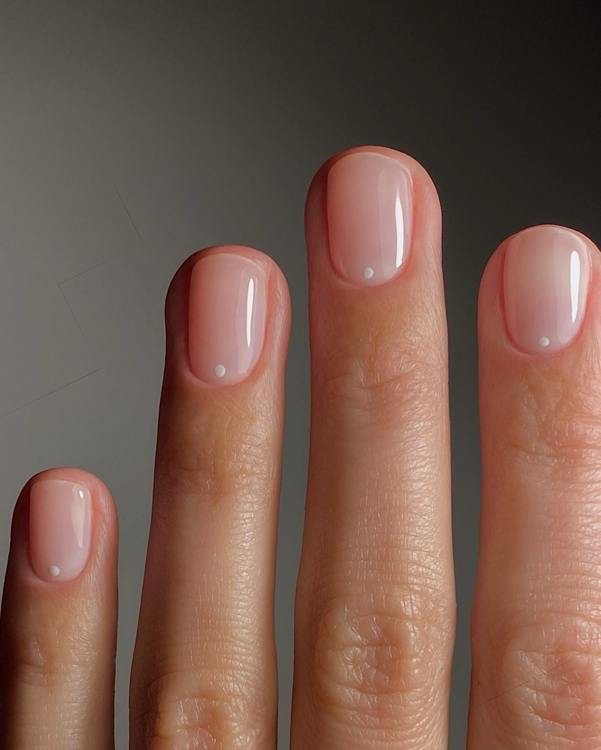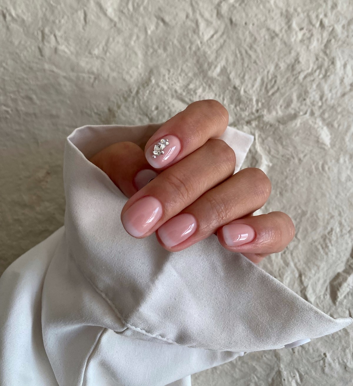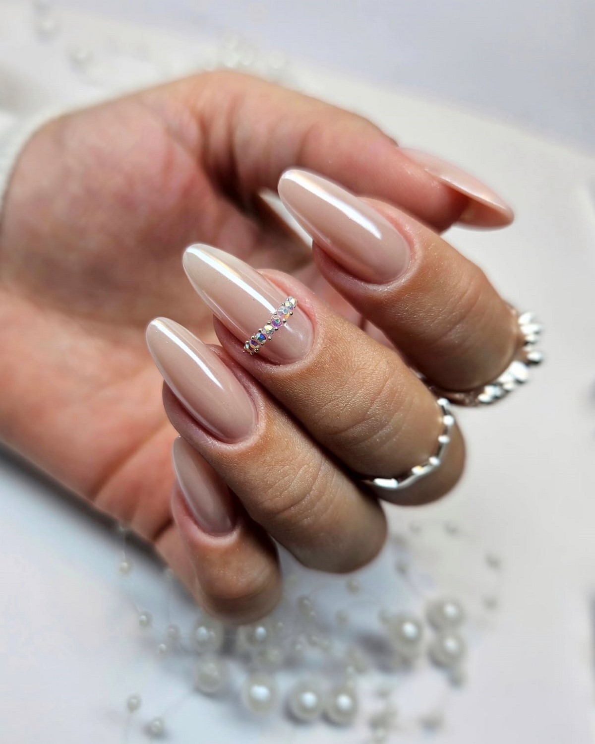 Минималистичный декор с акцентом на один-два ногтя позволяет сохранить изящество глазированного покрытия, не перегружая дизайн. Тонкие линии, точки и небольшие стразы становятся изысканным дополнением к сияющей основе.