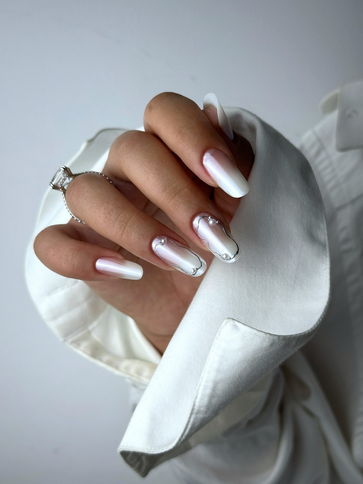 Жемчужный декор идеально дополняет глазированную текстуру, создавая эффект драгоценности и роскоши. Мелкие жемчужины могут формировать узоры, обрамлять ногтевую пластину или располагаться точечно для создания акцентов. Особенно актуален прием, когда жемчужины разного размера создают объемную композицию на одном-двух ногтях. Сочетание матового жемчуга с глянцевым глазированным покрытием создает интересную игру текстур, которая выглядит дорого и элегантно, идеально подходя для торжественных случаев.