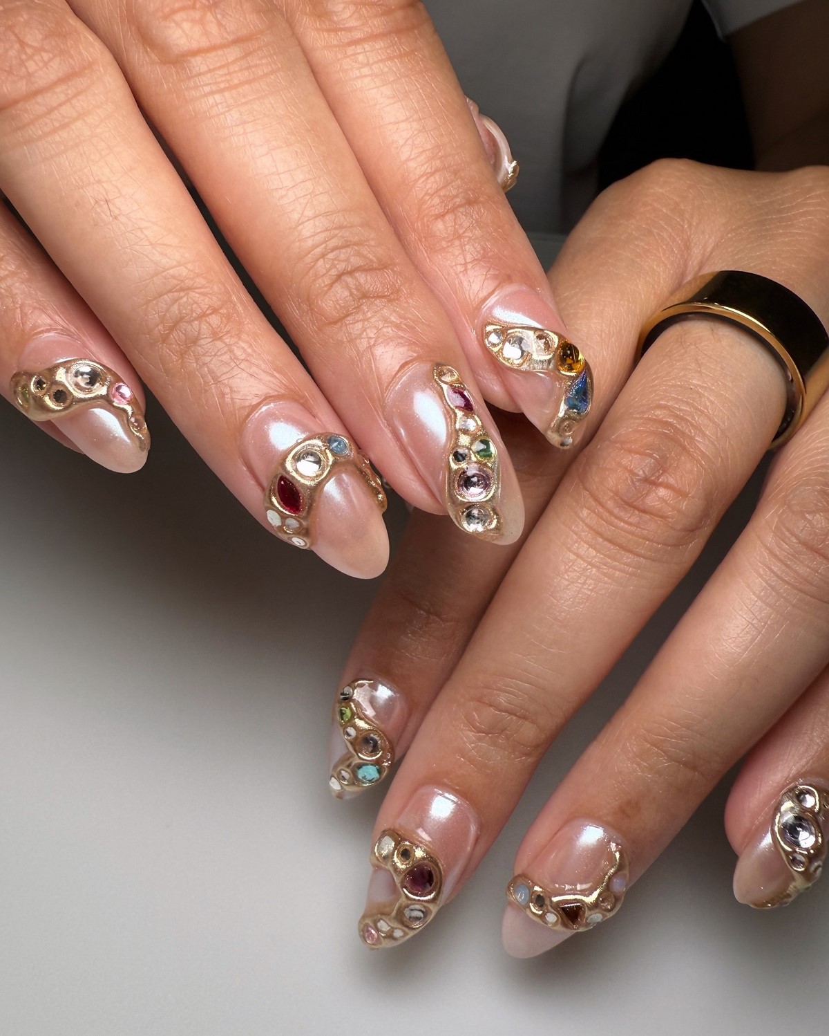 Инкрустация стразами на глазированной основе создает роскошный вечерний образ. Ключевое правило сезона — умеренность: лучше украсить один-два акцентных ногтя, чем перегрузить весь дизайн. Стразы могут образовывать геометрические узоры, обрамлять кутикулу или располагаться хаотично, создавая эффект капель росы на сияющей поверхности. Сочетание холодного блеска камней с теплым свечением глазированного покрытия создает изысканный контраст, который притягивает взгляды.