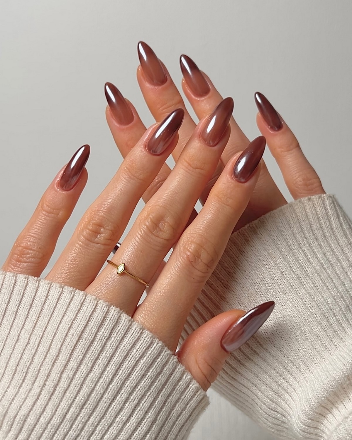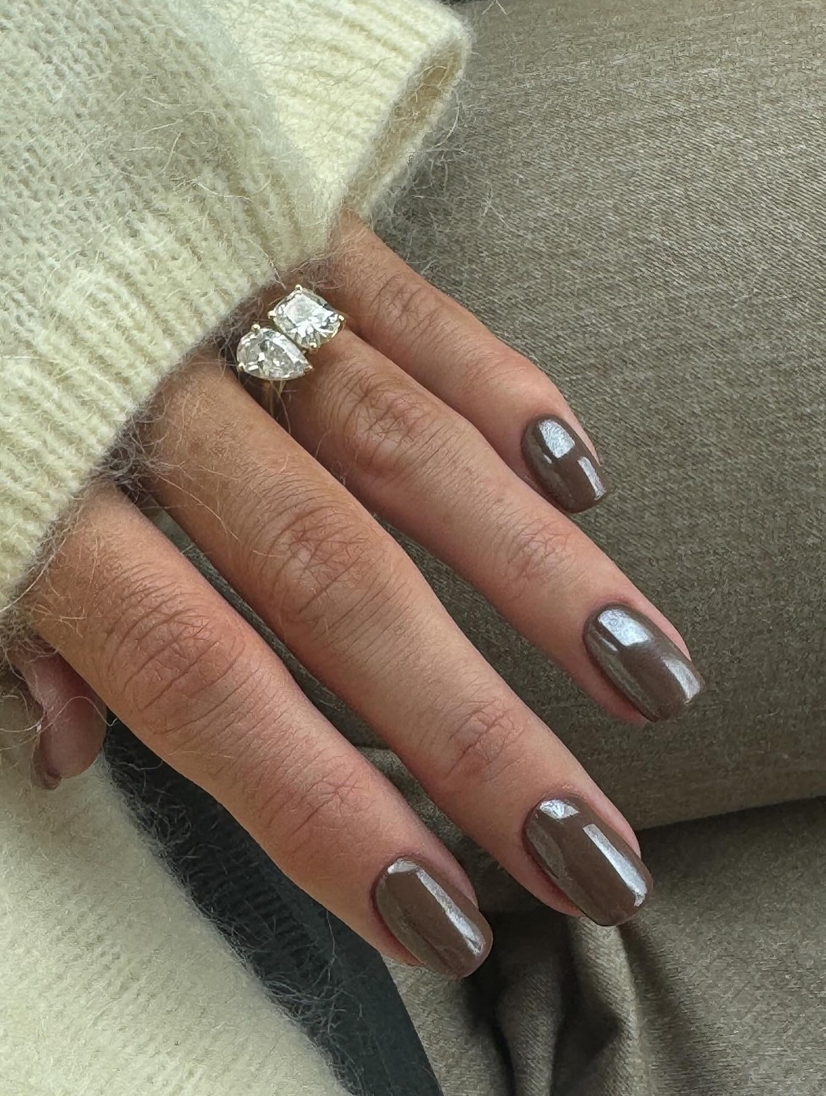 Этой осенью и зимой глазированный маникюр выходит за рамки классических нюдовых и пастельных оттенков. Глубокие винные, шоколадные и изумрудные тона с глазированным финишем становятся фаворитами сезона, идеально дополняя осеннюю цветовую палитру гардероба.